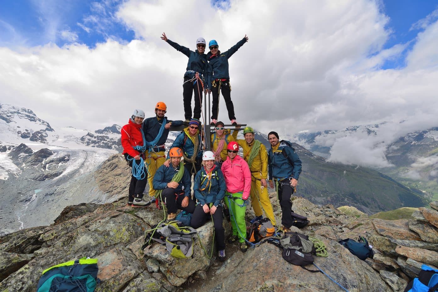 Geklettert wurden Mehrseillängen in vier Zweierseilschaften, wobei jeder Seilschaft ein Bergführer des Zermatt Alpin Center mit Rat und Tat zur Seite stand. Die Bergführer unterstützten ihre Schützlinge mit wichtigen Infos und guten Tipps, welche von den Teilnehmern mit grossem Interesse entgegengenommen und viel Engagement umgesetzt wurden. Nach knapp drei Stunden standen alle erfolgreich auf dem Gipfel des Riffelhorns.