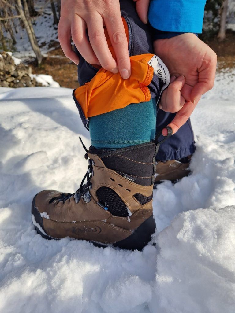 Dank der harten Sohle und des hohen Schafts eignet sich der AKU Superalp Therm200 GTX ideal für Schneeschuhtouren im Pulverschnee. Der Schuhschaft des warmen Winterwanderschuhs geht weit nach oben und schliesst dank eines Textilsatzes an der Lasche und an der Rückseite gut ab. Schnee hat keine Chance, ins Schuhinnere zu gelangen. Mit einer eng anliegenden Hose sind Gamaschen nicht erforderlich, was ich sehr befreiend finde.