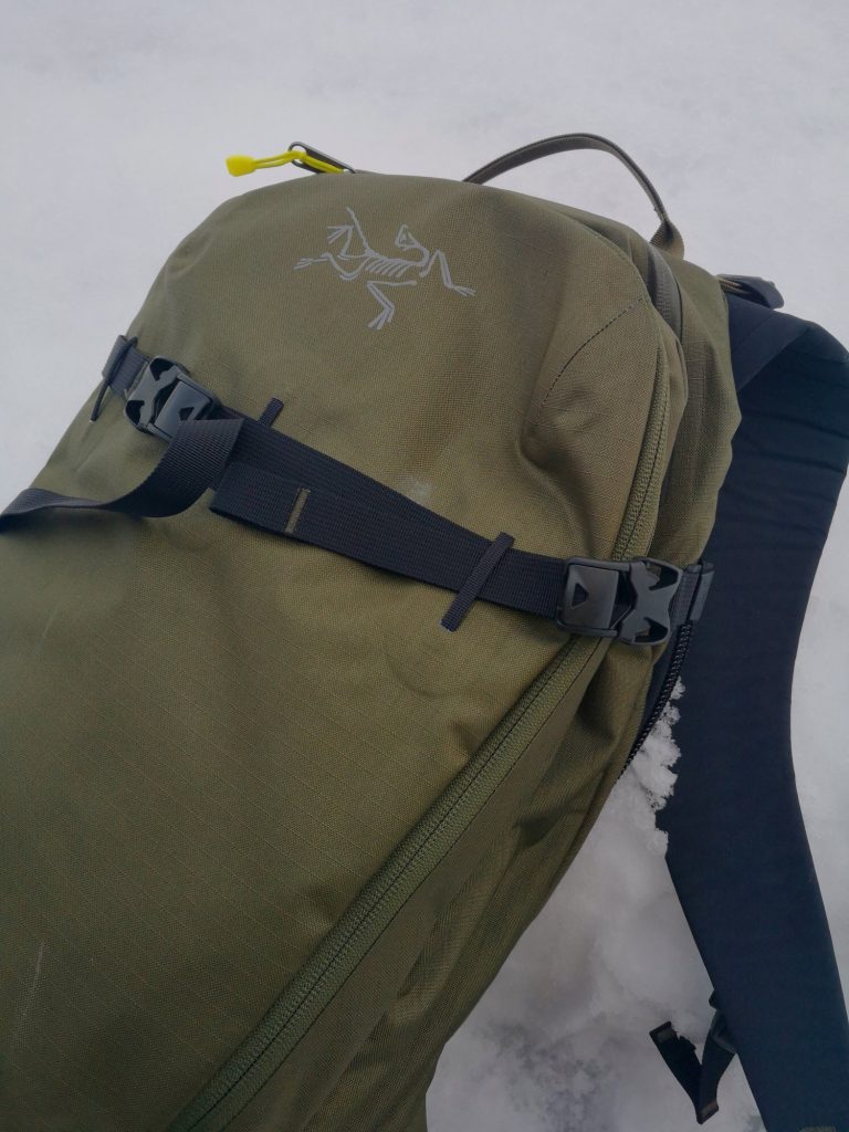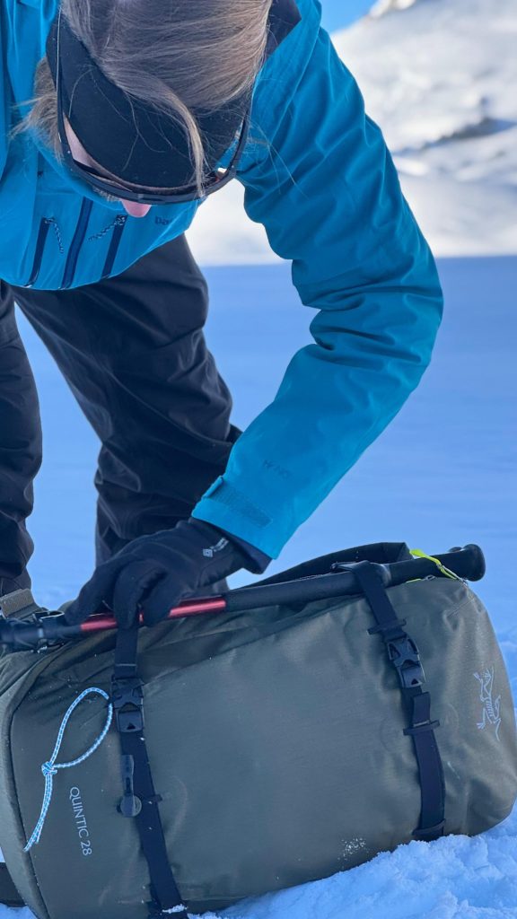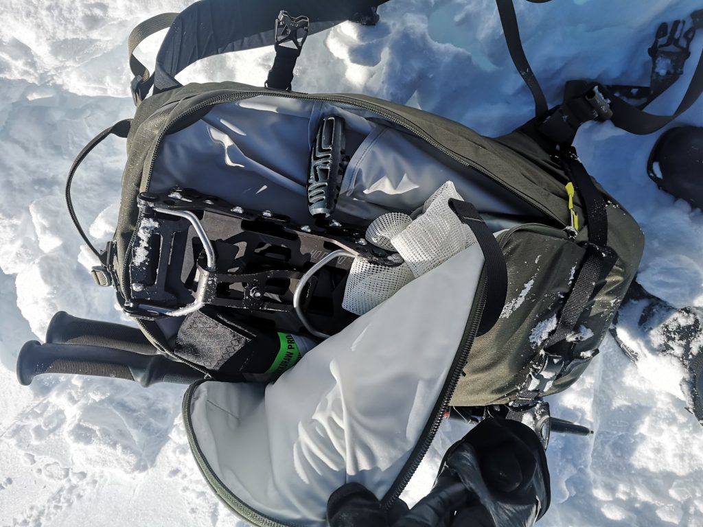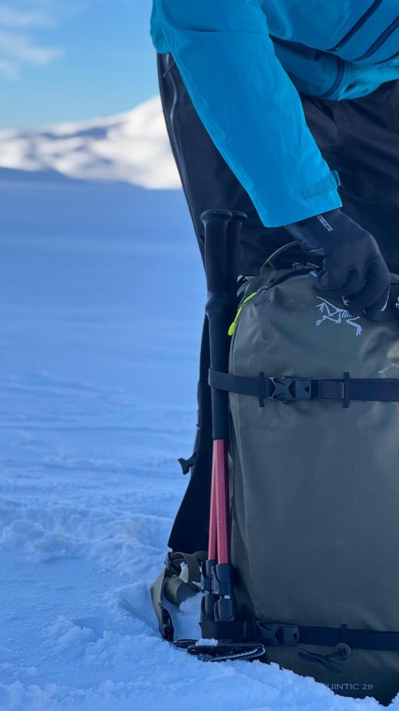 Der Arc’teryx Quintic 28 hat entspricht vom Konzept her einem Freeriderucksack mit klassischem Backloader zugang, also der Hauptzugang über den Reissverschluss am Rückenpanel, wie es auch andere Rucksäcke am Markt gibt und ist von dem her nichts neues. Auffallend ist dabei das grosse Frontfach für die Lawinenausrüstung, mit integrierten Halterungen für Sonde und Schaufelstiel. Die Zwischenwand, zwischen Hauptfach und Lawinenfach ist so konzipiert, dass diese sich an die jeweilige Beladung im Fach anpasst. Dies dadurch, dass etwas mehr Stoff vorhanden ist, und dieser sich je nach dem auf eine Seite drücken lässt. Jedoch führt dies auch zu meinem ersten Kritikpunkt. Durch die flexible Untertrennung verschwinden kleinere Gegenstände gefühlt in dem sehr grossen Lawinenfach und waren unterwegs schlecht auffindbar. Beispielsweise ein kleines Erstehilfe-Set. Allgemein könnte ich mir vorstellen, dass das Konzept beim Arc’teryx Quintic 16, dem kleineren Rucksack, besser funktioniert.