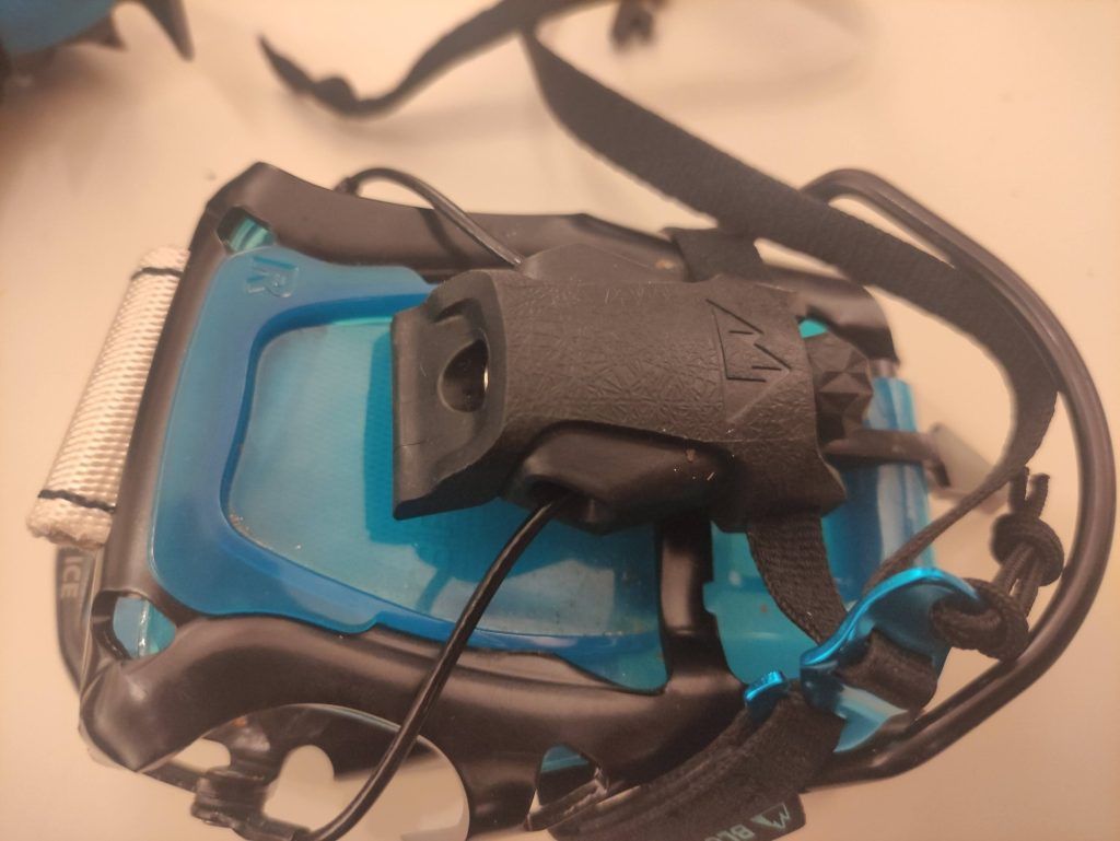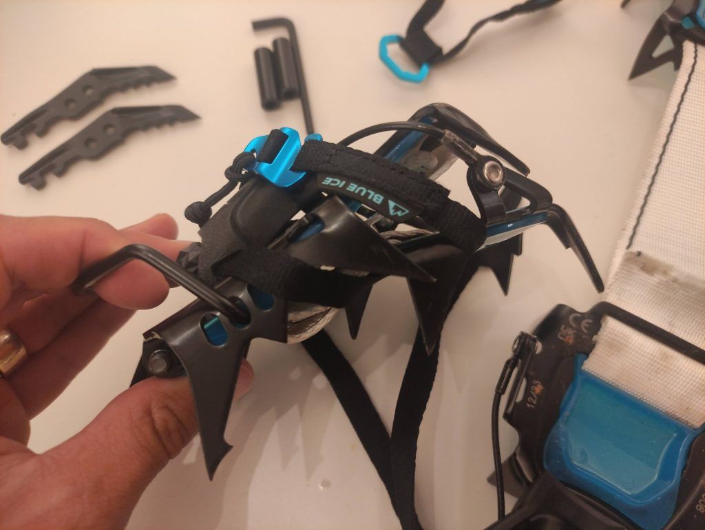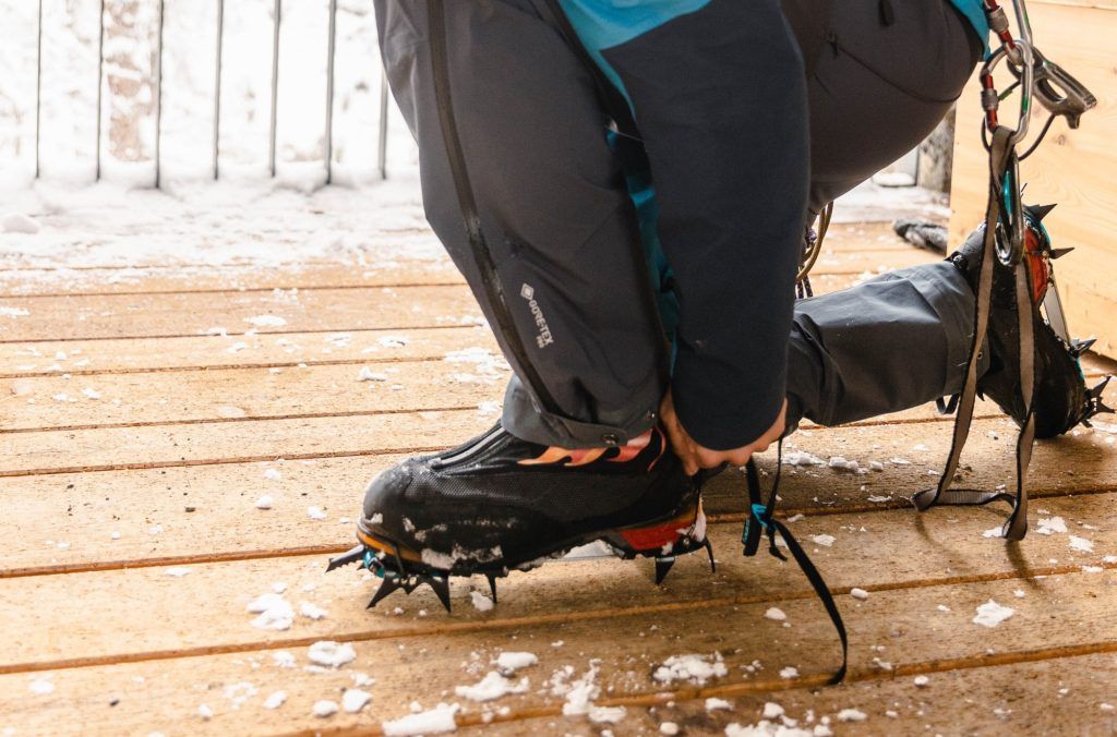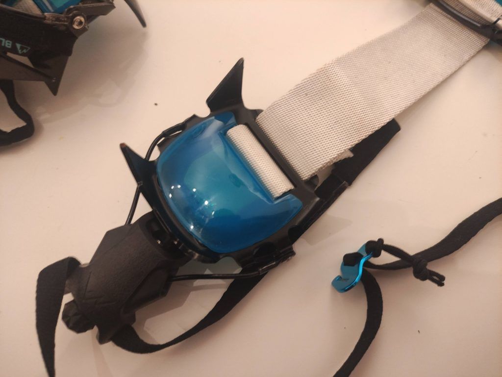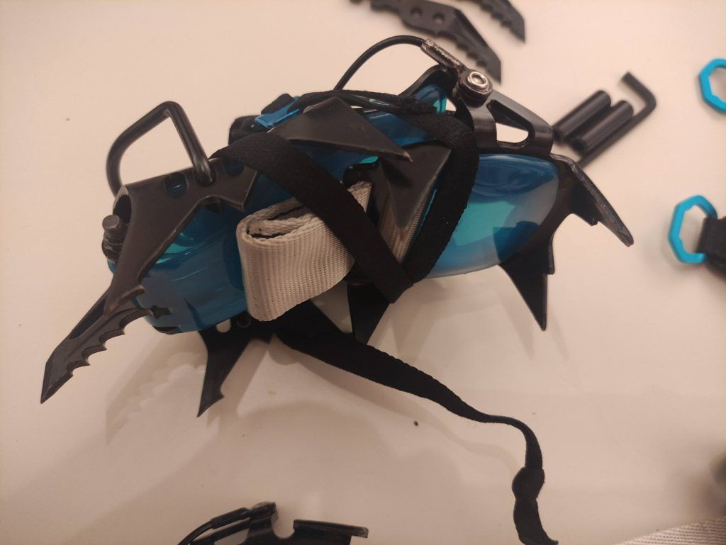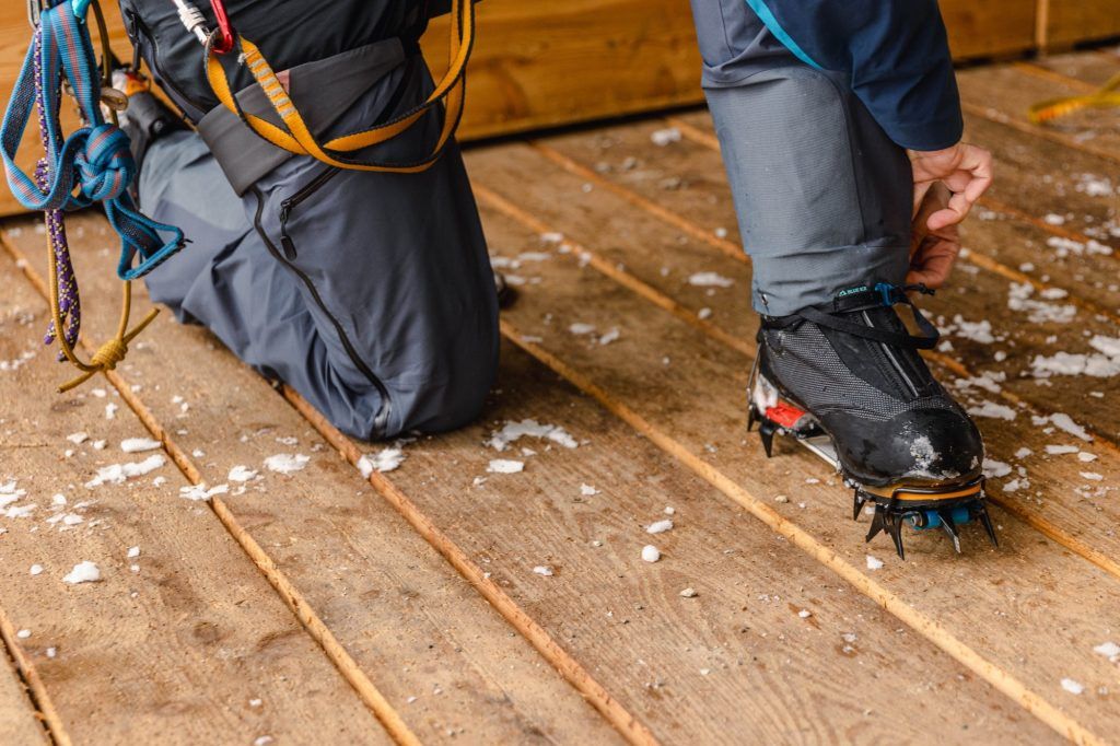 Die Anpassung der Blue Ice Harfang Tech ist einfach und benutzerfreundlich. Anders als bei vielen anderen Steigeisen sind keine lästigen Stahlteile zu montieren, was die Handhabung erleichtert. Das Dyneema-Band benötigt anfänglich eine gewisse Justierung, um einen optimalen Sitz zu gewährleisten. Nach ein oder zwei Anpassungen sitzt es jedoch sicher und fest, was für eine hohe Stabilität sorgt.
