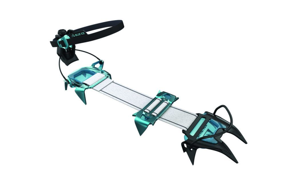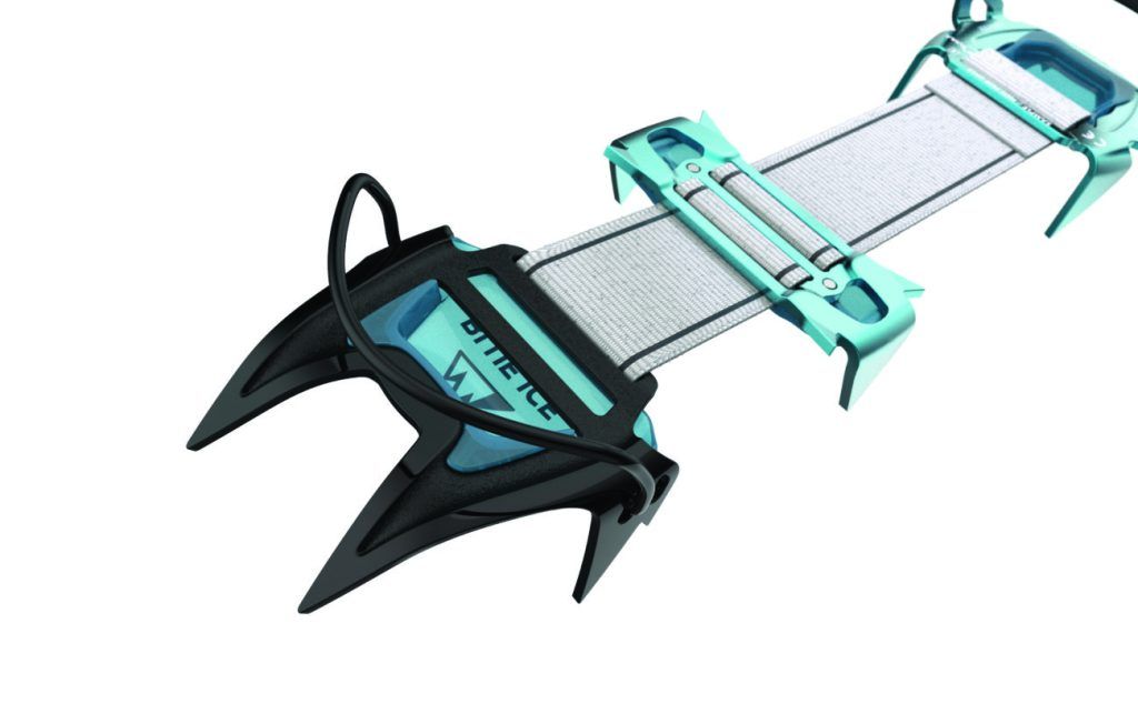 Blue Ice hat die Zackendinger neu überdacht und radikal abgespeckt. Mit dem Blue Ice Harfang (frz. für Schnee-Eule) kommt ein Steigeisen, das in seiner Kompaktheit kaum zu überbieten ist: Hinter- und Mittelteil aus Alu, Frontteil aus Stahl, verbunden durch ein breites, längenverstellbares Textilband, ausgerüstet mit einem Kunststoff-Kipphebel und einem minimalistischen Sicherungsband.