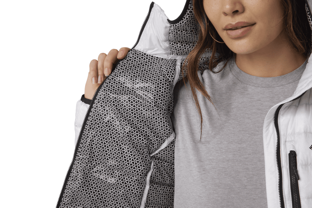 Wie funktioniert das Ganze? Die Sonnenenergie dringt durch die äusseren Schichten und wird von der schwarzen, wärmeabsorbierenden Folie auf der Innenseite, bekannt als Omni-Heat Black Dot, gespeichert und in Wärme umgewandelt. Das Design ist von geodätischen Kuppelgewächshäusern inspiriert und besteht aus schwarzen Dreiecken und Punkten. Diese spezielle Kombination reduziert den Wärmeverlust und hält die Wärme der Sonne auch nach Sonnenuntergang nah am Körper. Das Ergebnis ist leichte, hocheffiziente Wärme, die durch Sonnenenergie verstärkt wird.
