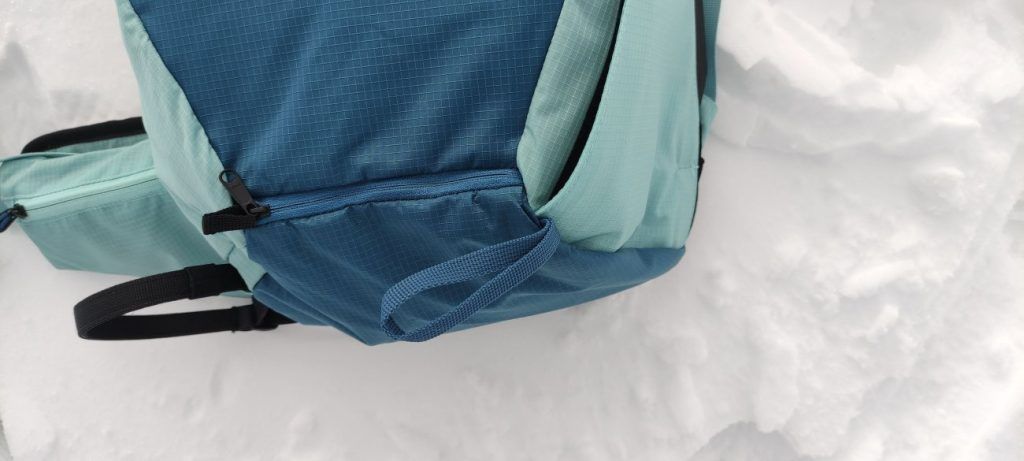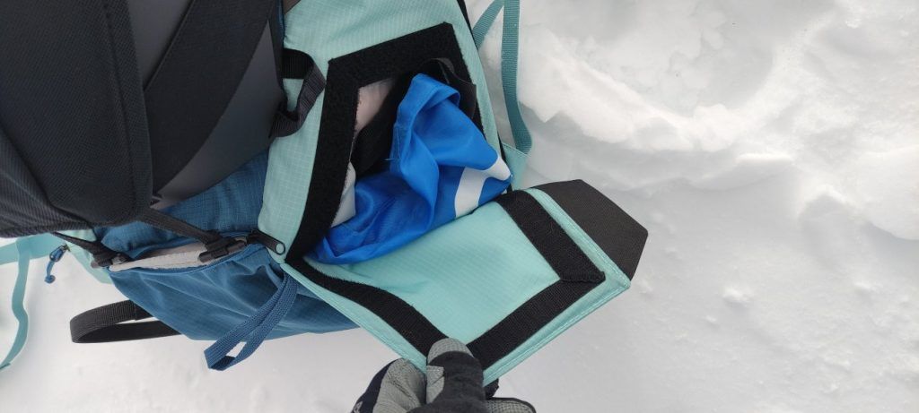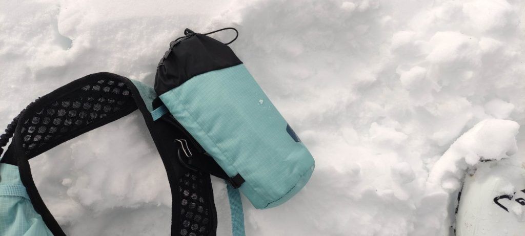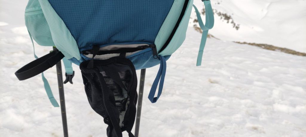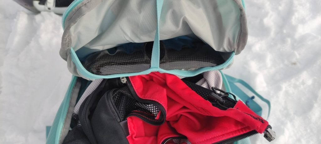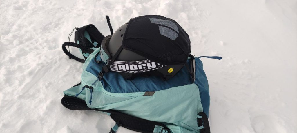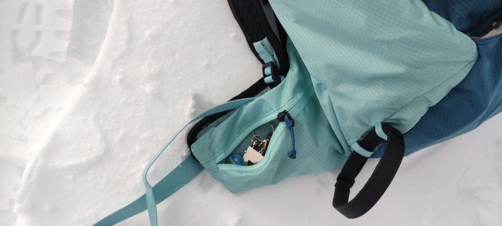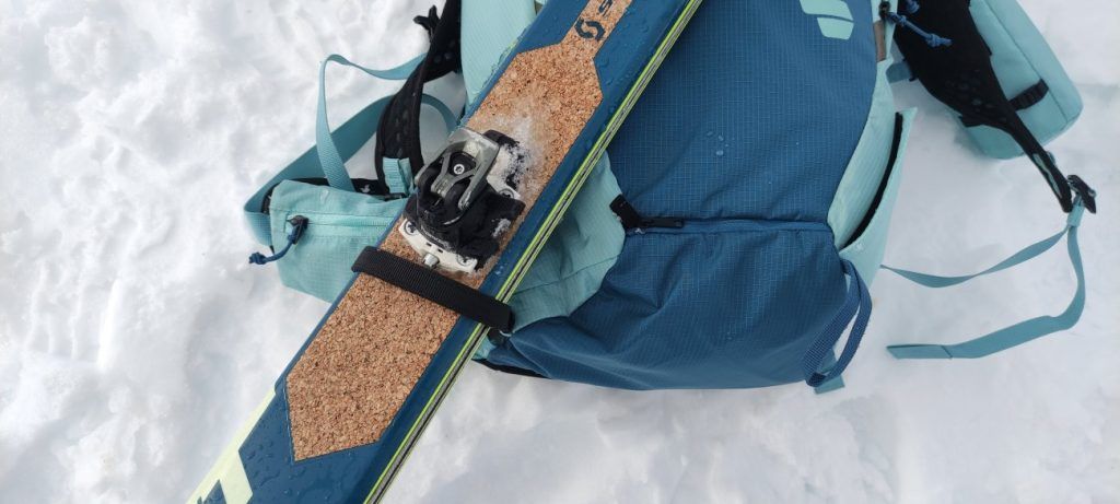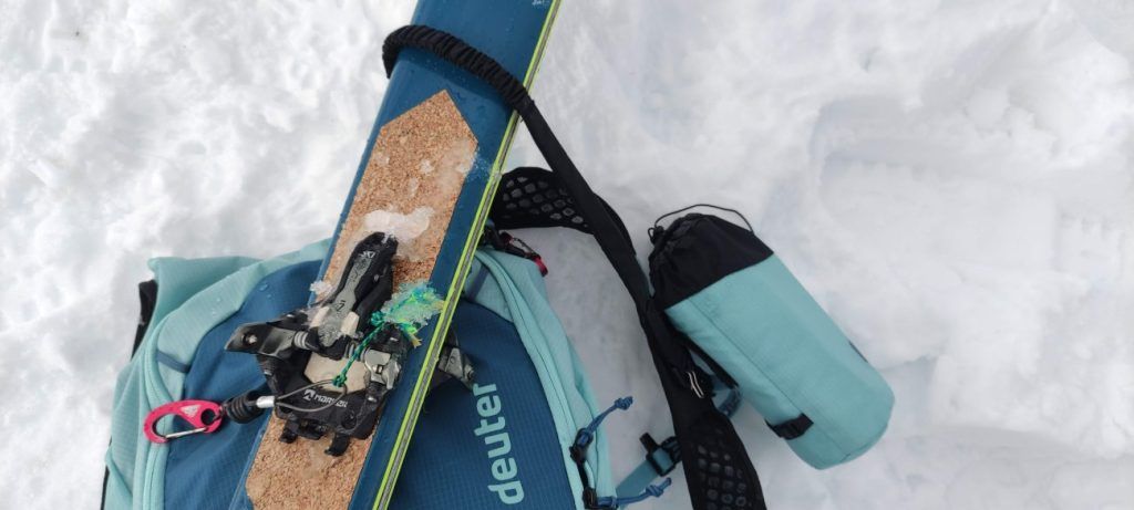 Der Deuter Updays 20 bietet viele praktische Funktionen. Eine einfache, schnelle diagonale Skifixierung ermöglicht es, die Tourenskier sicher zu tragen. Besonders gefällt mir, dass die untere Fixierung an die Skibreite angepasst werden kann, was viele andere Rucksäcke nicht bieten. Ein leicht zugängliches Bodenfach bietet Platz für Felle, Harscheisen oder Steigeisen, ohne den Rucksack abnehmen zu müssen. Der Rucksack hat ein verstaubares, abnehmbares Helmnetz. Am Schultergurt befindet sich eine isolierte Tasche für die Trinkflasche, die auch bei niedrigen Temperaturen gut funktioniert.