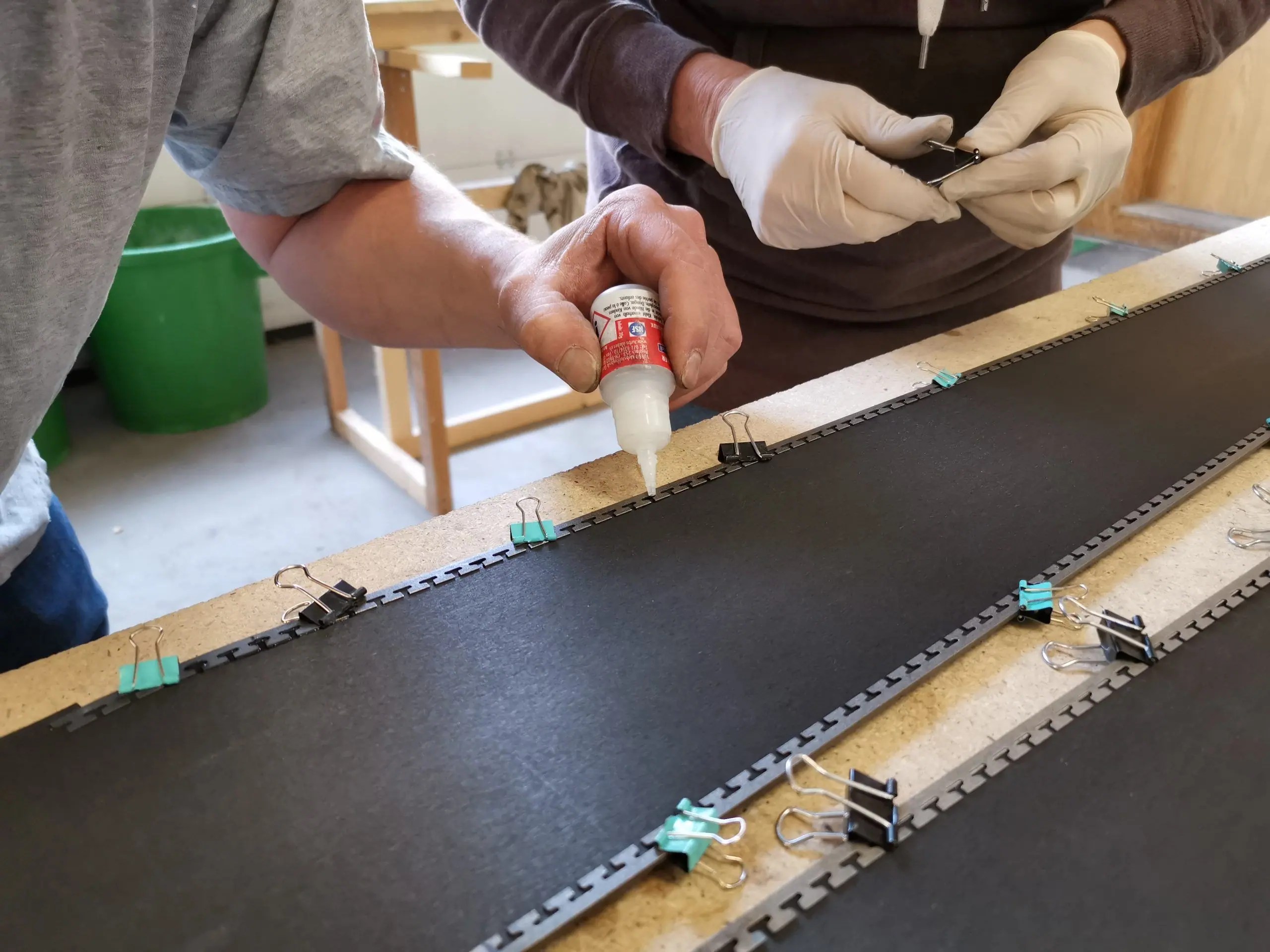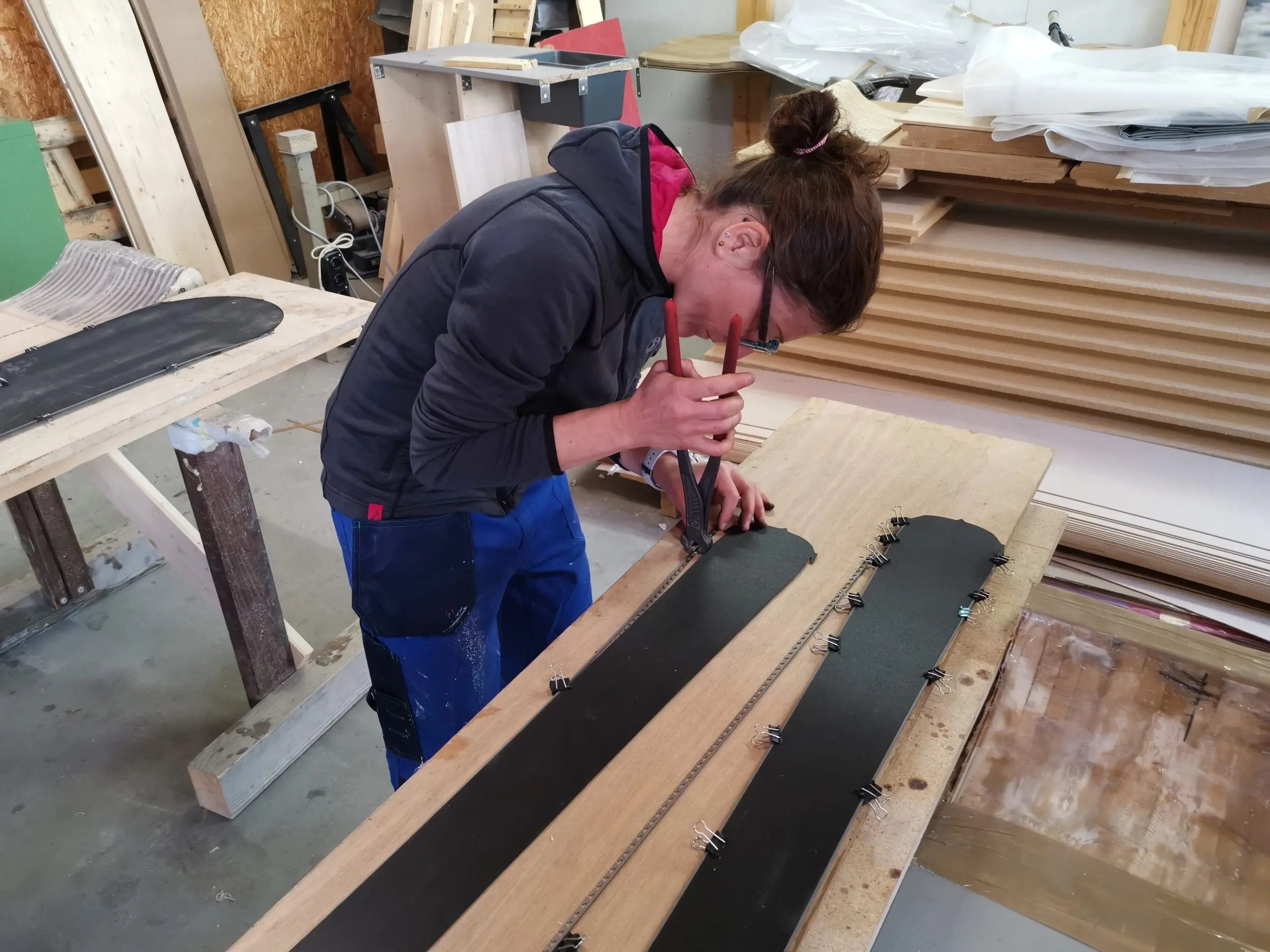 Urs, Ben und Pirmin liessen uns zum Hinterfragen nicht gross Zeit. Die Kanten mussten befestigt werden. Mithilfe der Drei und völlig tiefenentspannt (na ja, fast immer) haben wir die vorbereiteten Kanten an die Beläge geheftet, gebogen und angeleimt. Dabei habe ich mich zum ersten Mal gefragt: wieso mache ich eigentlich einen Ski, welcher vier Kanten hat und nicht ein Snowboard mit nur zwei Kanten?