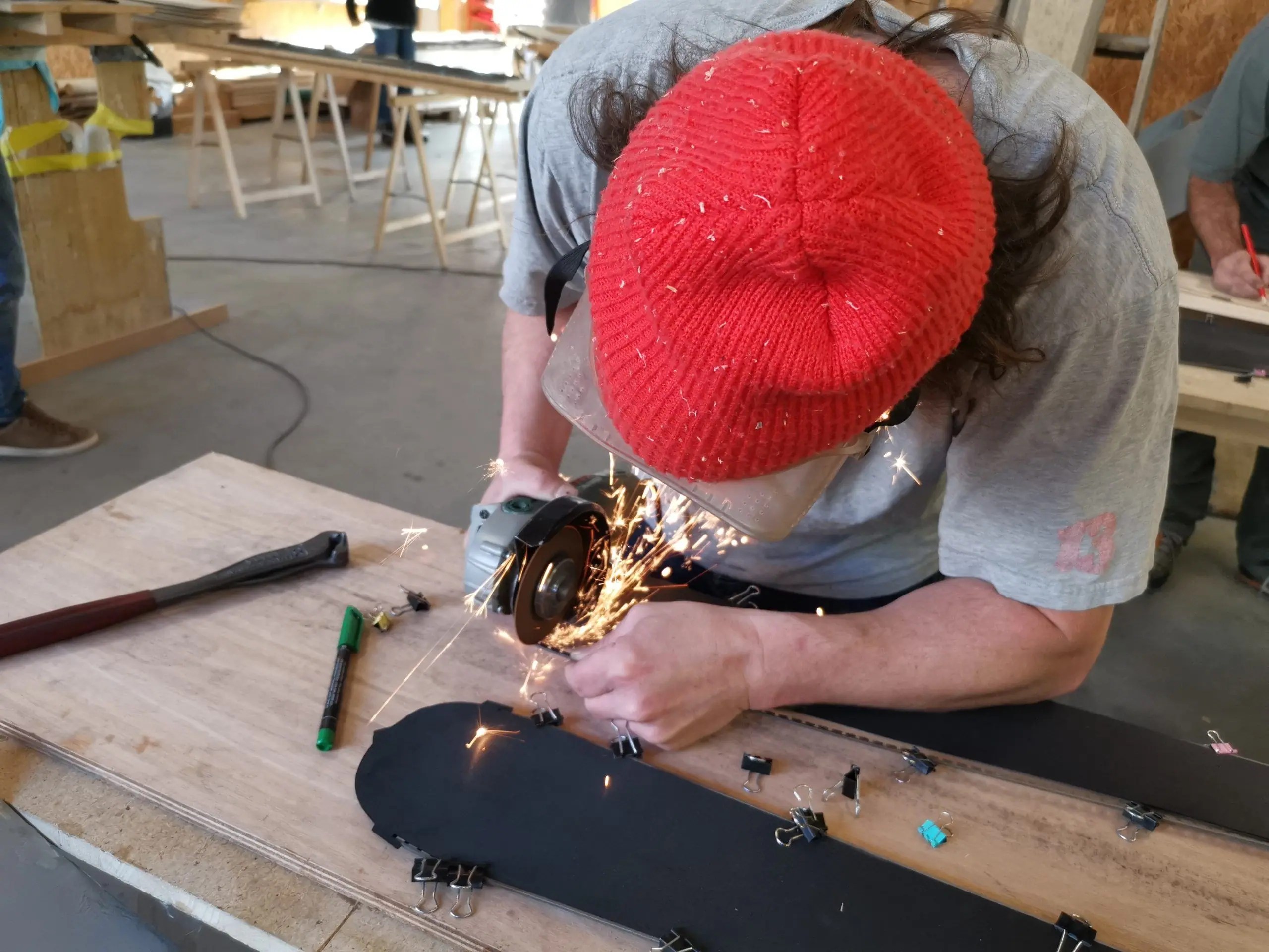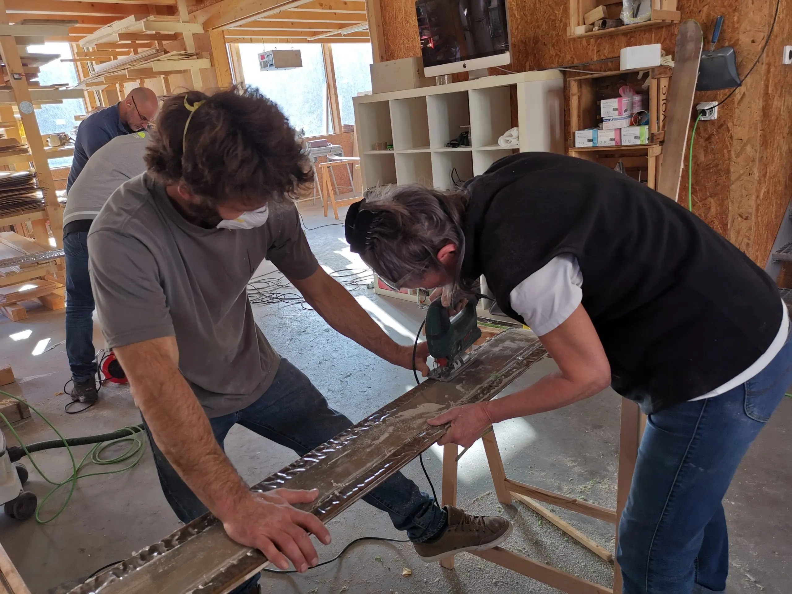 Was nun folgte, war kräftezehrendes Schaben, damit wir die Oberschicht vom überflüssigen Leim befreien konnten. Danach wurde es laut; mit der Stichsäge schnitten wir entlang der Kanten unsere Bretter aus. Nach dem Schleifen wurden die seitlichen Ränder gebrochen und abgeschliffen, damit der Ski (natürlich auch das Snowboard) an Eleganz gewinnt.