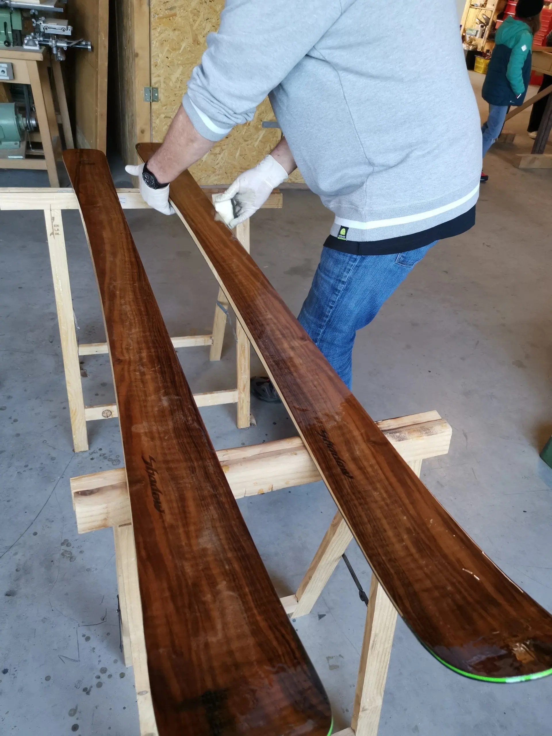 Nun bekommen unsere Bretter nach der fachmännischen Anleitung vom Ölspezialisten für Parkettböden (unser Wintersportgerät ist sehr stark der Feuchtigkeit ausgesetzt) die letzte Ölung. Es handelt sich um eine wohlriechende Spezialölmischung. Innerhalb eines Wisches verwandelt sich das Furnier zu einem unglaublichen, brillierenden und wunderschönen Anblick. Die Augen der Teilnehmer glänzen und man spürt die Spannung und Vorfreude bei der Vorführung.