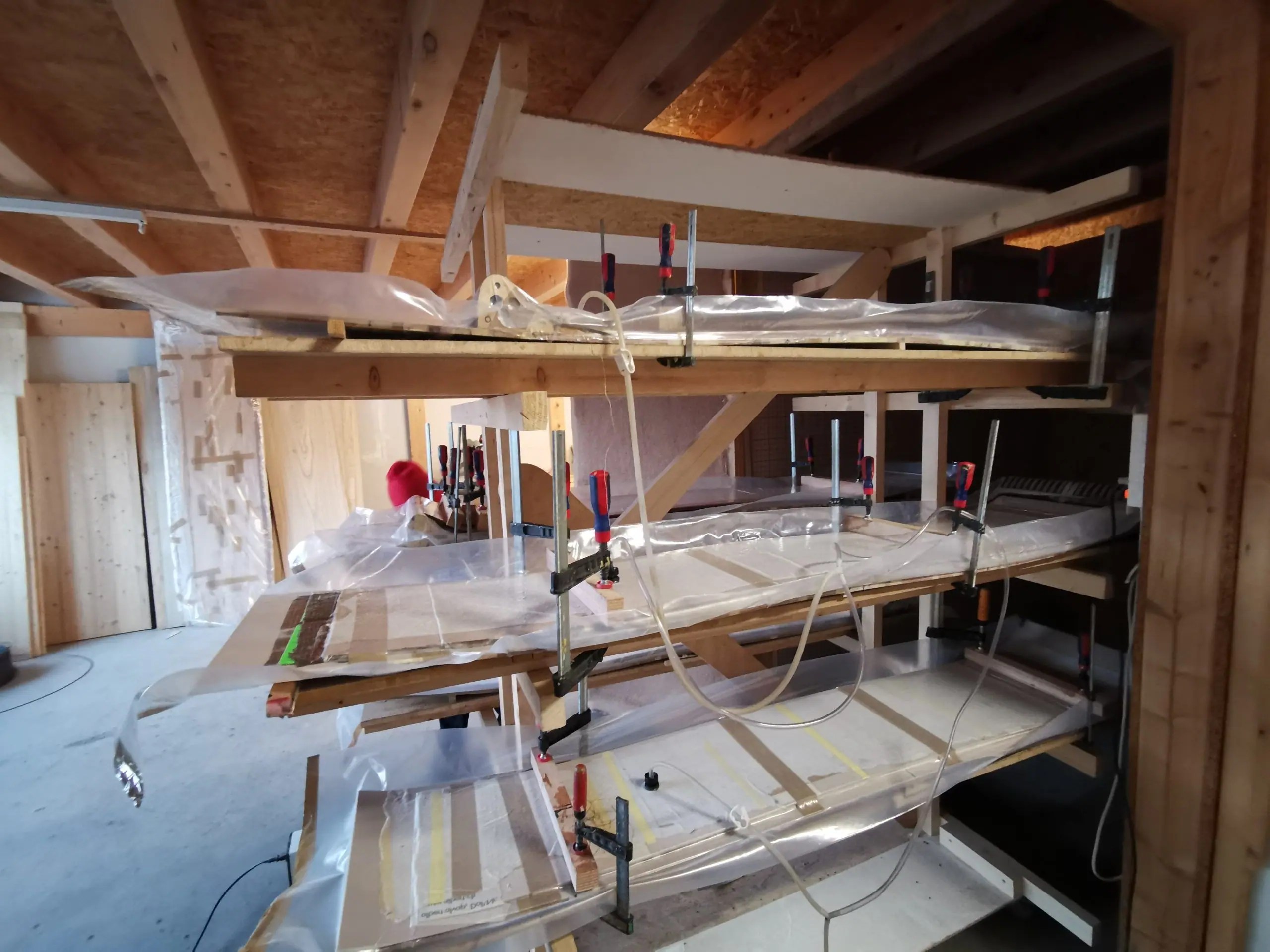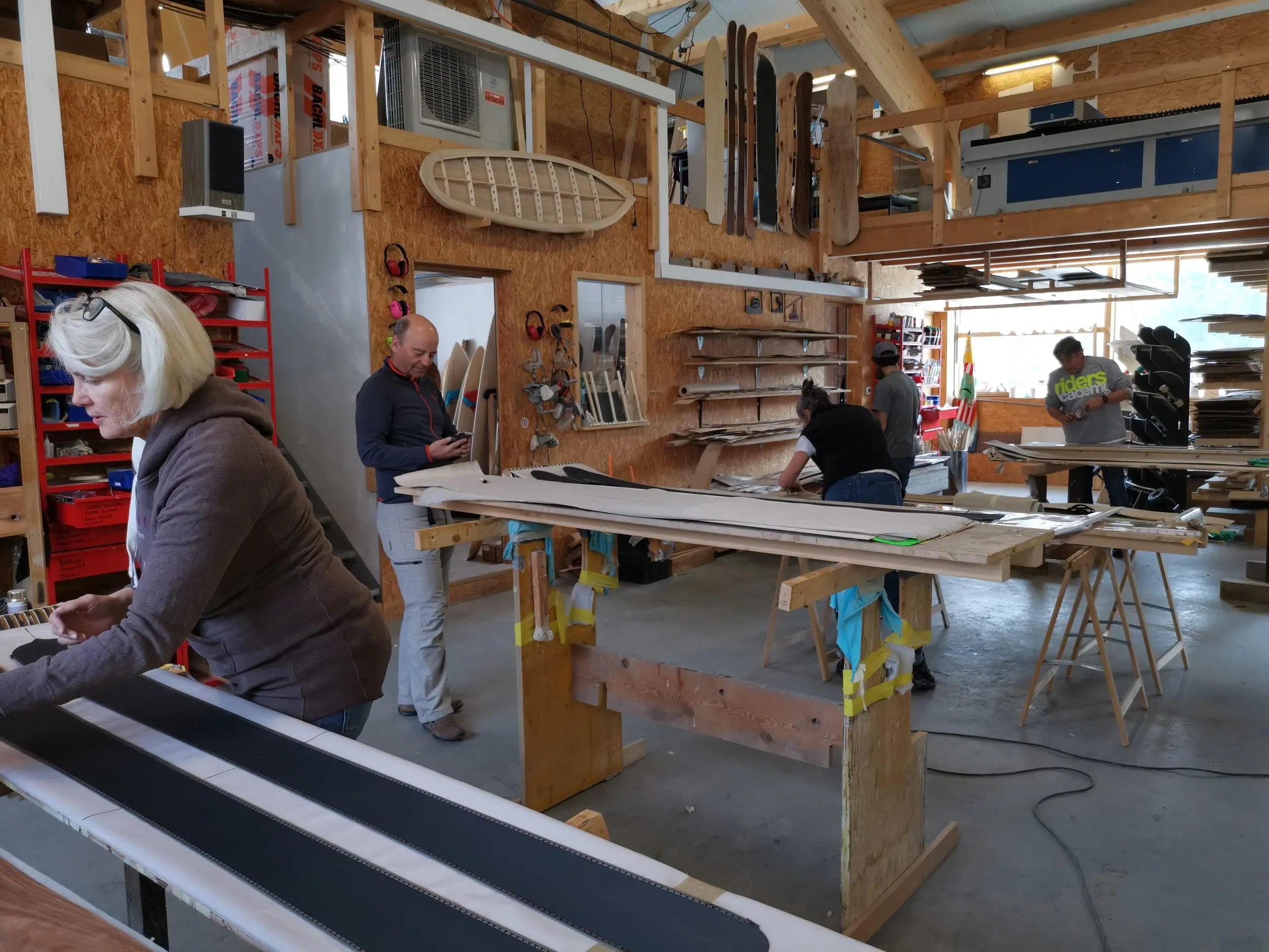 Diese Arbeit war zwar nicht hektisch, trotzdem wurde zügiger gearbeitet. ‚Das Paket‘ musste rasch und sauber zusammengesetzt werden, damit es rechtzeitig ins Vakuumpaket gepackt werden konnte. Zu diesem Zeitpunkt musste auch die Vorspannung bestimmt werden. Dafür stand uns das Team vom ENLAIN Skibaukurs ihrem Fachwissen tatkräftig zur Verfügung. Das Trocknen und die Formgebung (Rocker, Camber, usw.) erledigt sich über Nacht wie von selbst.