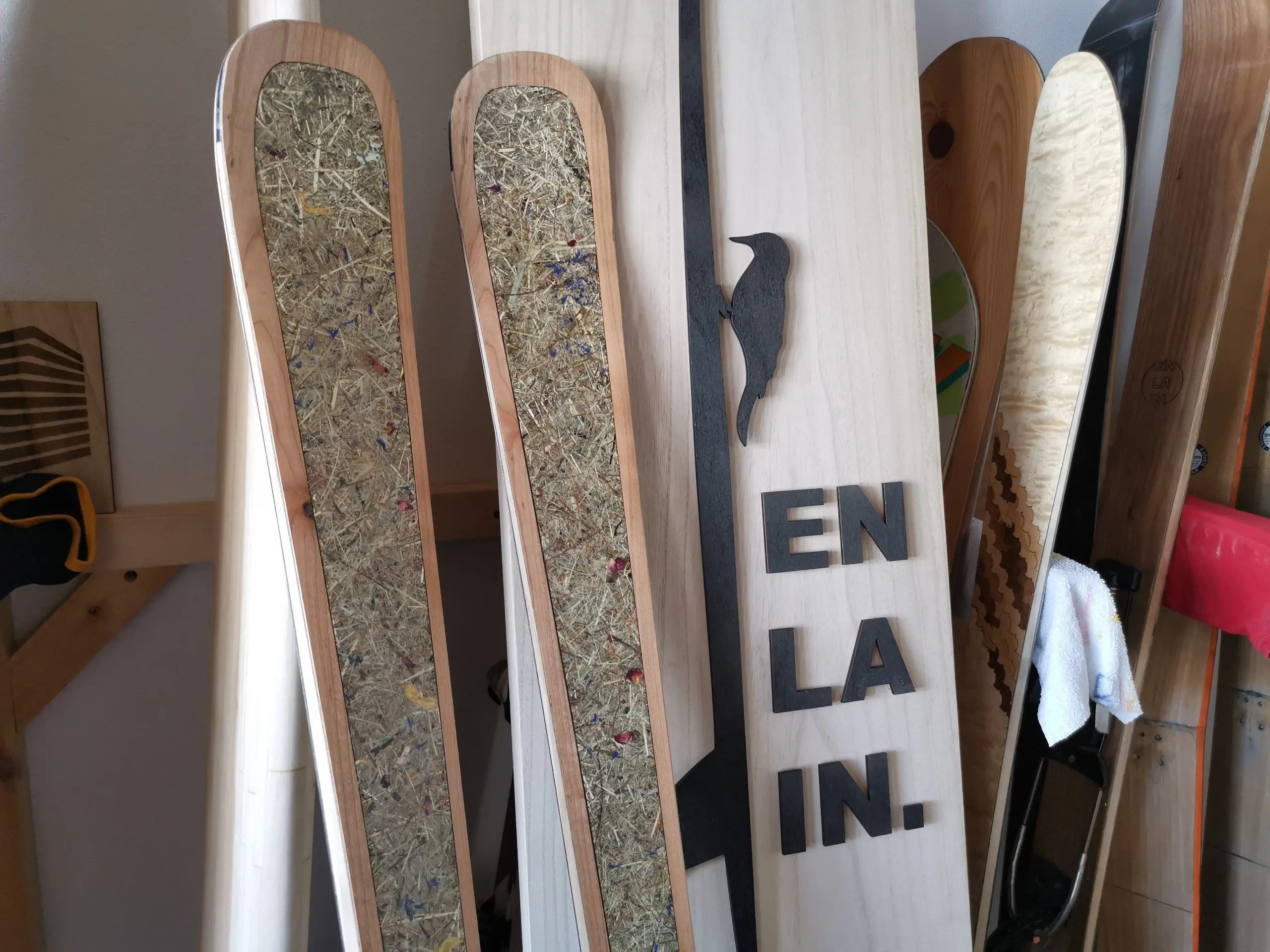 Auch betreffend Materialien ist ENLAIN offen und es wird fleissig getüftelt. Ein Produkt aus einem der Experimente befällt mir besonders: der Heu-Ski.