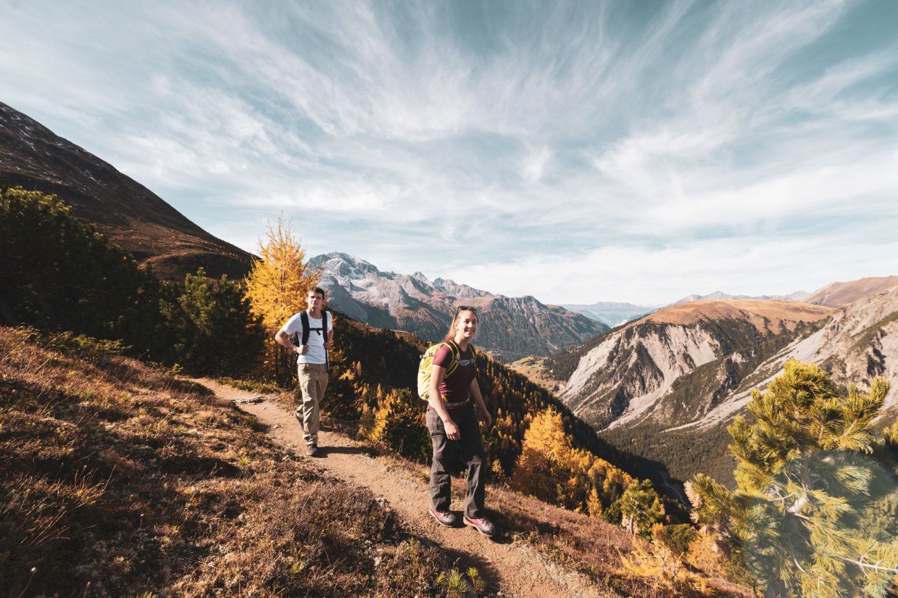 Gerade im Herbst lädt die Bergwelt Graubündens zu genussvollen Touren ein. Auf den Wanderwegen wird es ruhiger, die Wälder erstrahlen in goldenen Farben und in unmittelbarer Nähe erheben sich die majestätischen Gipfel und glitzern weiss im goldenen Sonnenlicht.