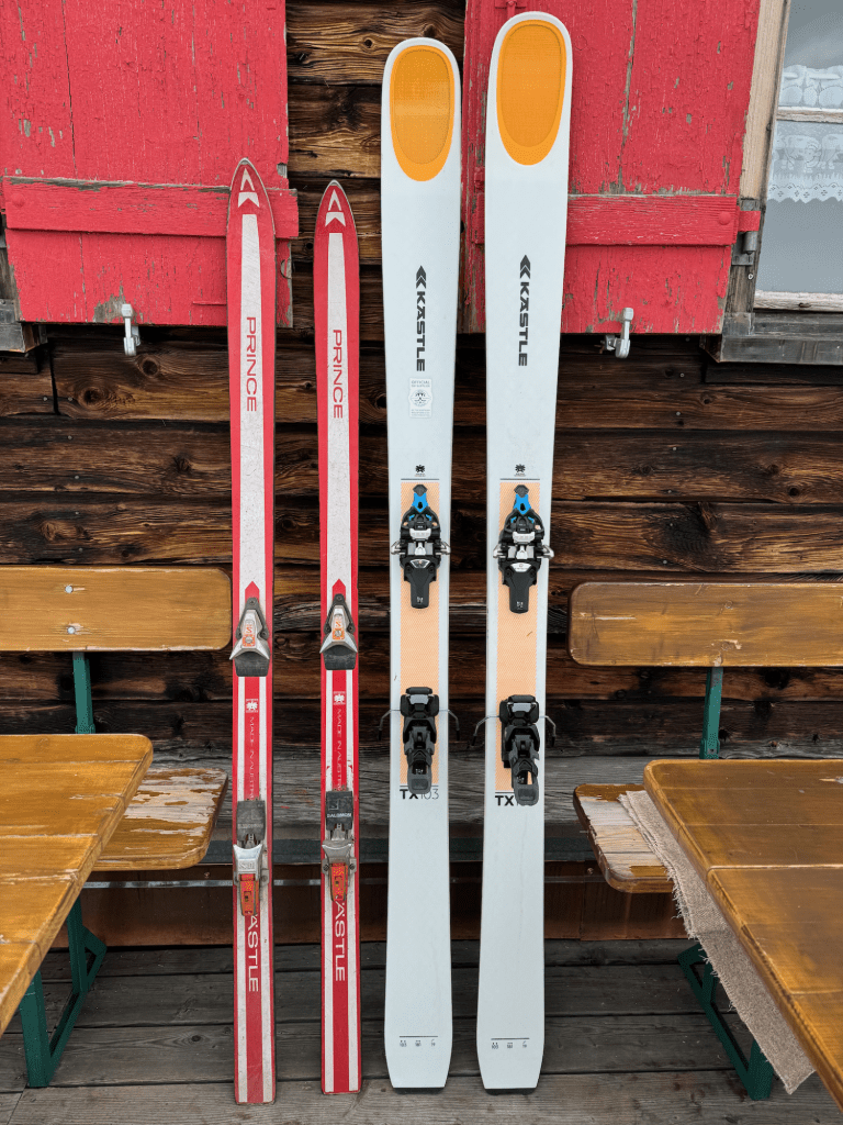 Ich habe dieses Bild vor einem Davoser Bergrestaurant geschossen, zu dem ich extra aufgestiegen bin, nachdem mir der alte Kästle Prince Ski in der Ecke des Raums ins Auge gefallen war. Die Nebeneinanderstellung des uralten Kästle Prince mit dem modernen Kästle TX103 zeigt eindrucksvoll, wie sich Ski über die Jahrzehnte entwickelt haben. Während der TX103 als moderner Freetouring-Ski mit innovativer Technologie und fortschrittlichen Materialien überzeugt, verkörpert der Kästle Prince, der aus den 1970er bis 1980er Jahren stammen könnte, eine vergangene Ära des Skisports.