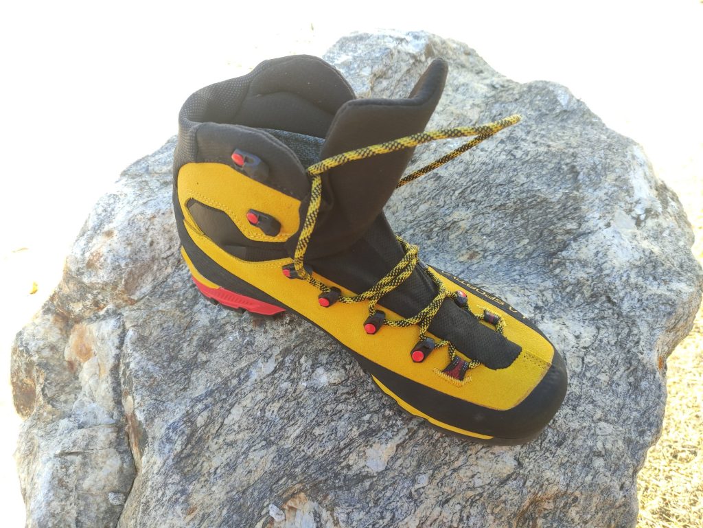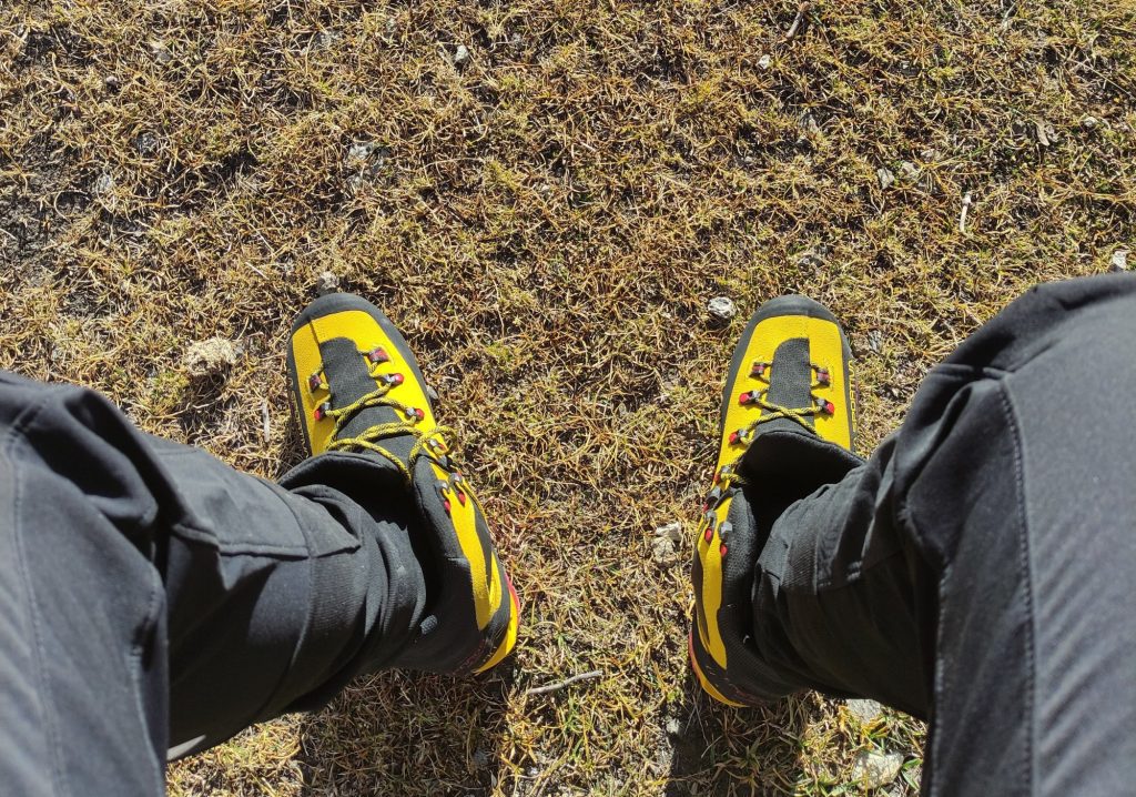 Der La Sportiva Trango Alpine Gtx wirkt schon beim Auspacken hochwertig. Das gelbe Design fällt auf, ohne zu grell zu sein. Ich trage normalerweise Grösse EU 44 / UK 9.5–10. Für den Test hatte ich denselben Wert, also EU 44 / UK 9.5, und die Passform stimmte perfekt. Anfangs war der Schuh etwas steif, und ich hatte eine kleine Druckstelle am Sprunggelenk. Nach ein paar Tagen war das aber vorbei. Man muss ihn definitiv einlaufen, aber das ist bei Bergschuhen dieser Kategorie normal.