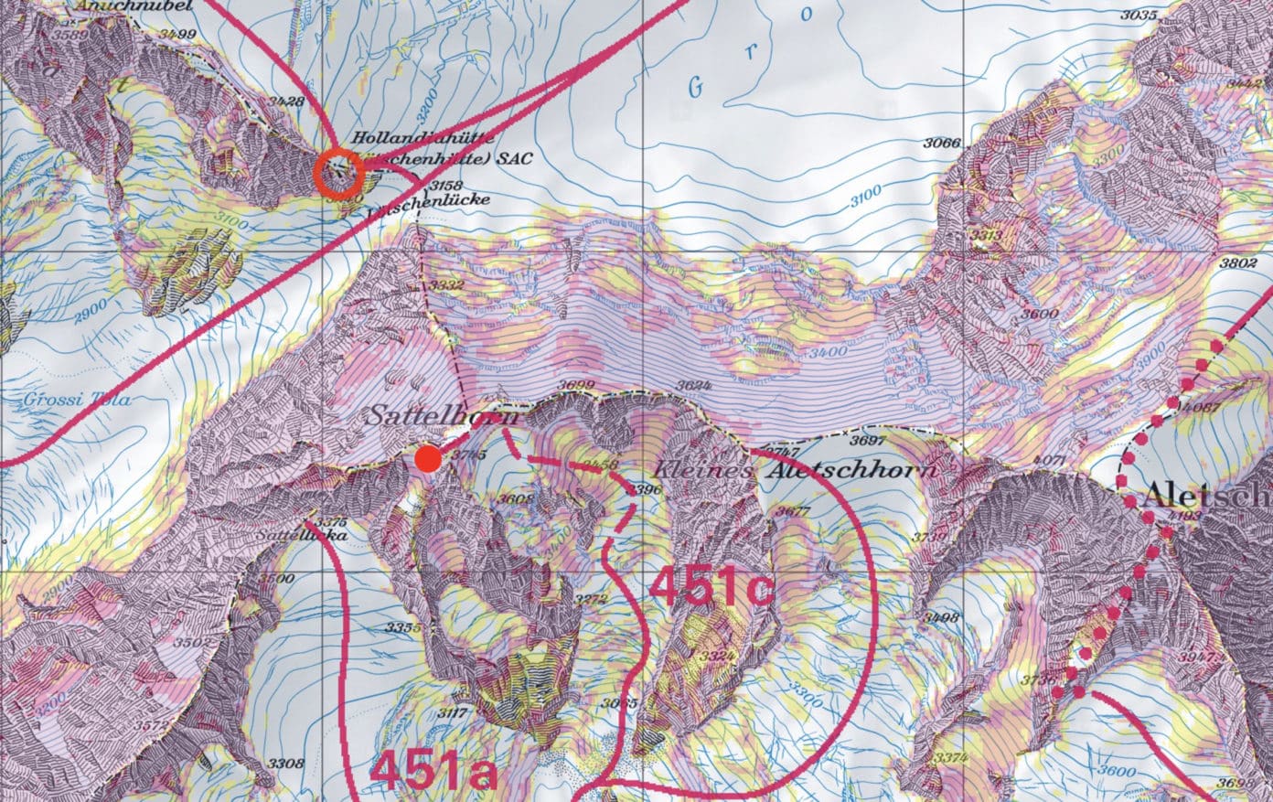 Route 451a – Von der Oberaletschhütte via Sattellicka, WS-, bei Abfahrt vom Gipfel im Couloir S+ (140 Hm 40°, anschliessend kurz 43°, exponierte Passagen); steiles, felsdurchsetztes Gelände;
