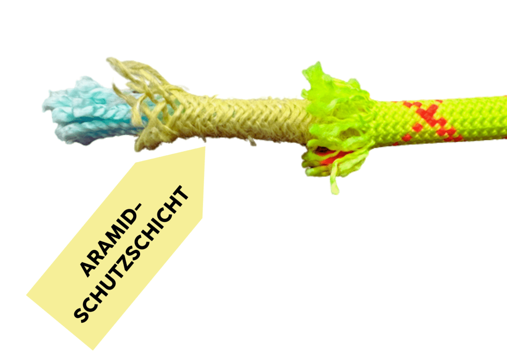 Um den Kern des Seils liegt eine zusätzliche Schutzschicht aus Aramid, einem Material, das für seine Hitzebeständigkeit und Festigkeit bekannt ist. Diese Schicht ist strategisch zwischen der äusseren Hülle und dem Kern platziert, die beide aus Polyamid 6 bestehen, das für seine dynamischen Eigenschaften bekannt ist. Die Aramidhülle ist mit Überlänge geflochten, sodass sie sich unter Spannung über eine scharfe Kante vollständig entfalten kann, um den Kern zu schützen, ohne der maximalen Sturzenergie ausgesetzt zu sein. Die Positionierung unterhalb des Mantels schützt das Aramid vor UV-Strahlung und reduziert den Verschleiss an Karabinern und Sicherungsgeräten.