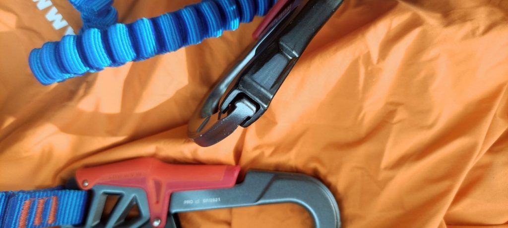 Das Mammut Skywalker Pro Turn Via Ferrata Set lässt sich mit der grossen Schlinge mühelos einbinden, was beim älteren Modell nicht so einfach war. Am Klettergurt fällt sofort das kompakte Mass des Bandfalldämpfers auf. Beim Gehen stört das Set nicht und schwingt nicht unnötig herum. Die Karabiner lassen sich leicht und leise öffnen und schliessen. Auf einem nächtlichen Klettersteig musste ich zweimal schauen, ob der Karabiner eingehängt war, so leise schloss er.