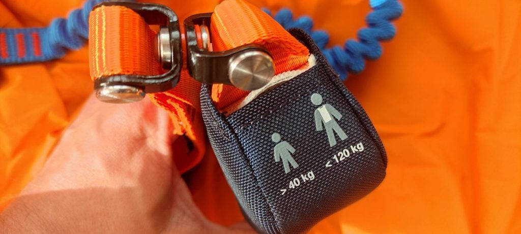 Das Klettersteigset bietet viele durchdachte Details. Zur Sicherheit: Ein Indikator zeigt, wann das Set ausgetauscht werden muss und ob der Bandfalldämpfer schon eingesetzt wurde. Das Set erfüllt alle gängigen Normen und wurde unter Fair Wear Standards hergestellt. Besonders auffällig ist der kompakte Bandfalldämpfer, der nicht herumschwingt. Das patentierte Drehgelenk ist ein weiteres Plus. Die leichten Karabiner mit grosser Schnapperöffnung funktionieren einwandfrei. Die elastischen Arme sind praktisch kurz und lassen sich auf 81 cm strecken. Eine integrierte Standplatzschlinge lädt zu Pausen mit Aussicht ein.