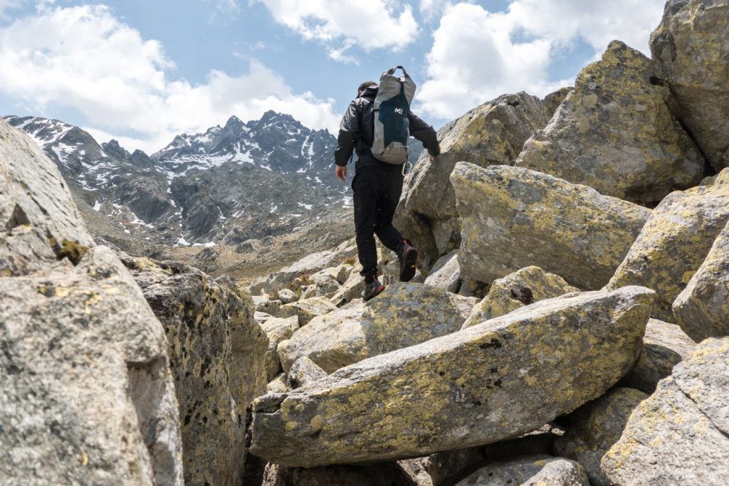 Dann geht es um einen Zustieg bei einer Mehrseillängen-Klettertour. Dabei geht es weglos über Blockgestein. Hier kommt es vor allem auf die Reibung an. Die Vibram-Sohle des Millet Super Trident Matryx GTX enttäuscht mich dabei nicht.