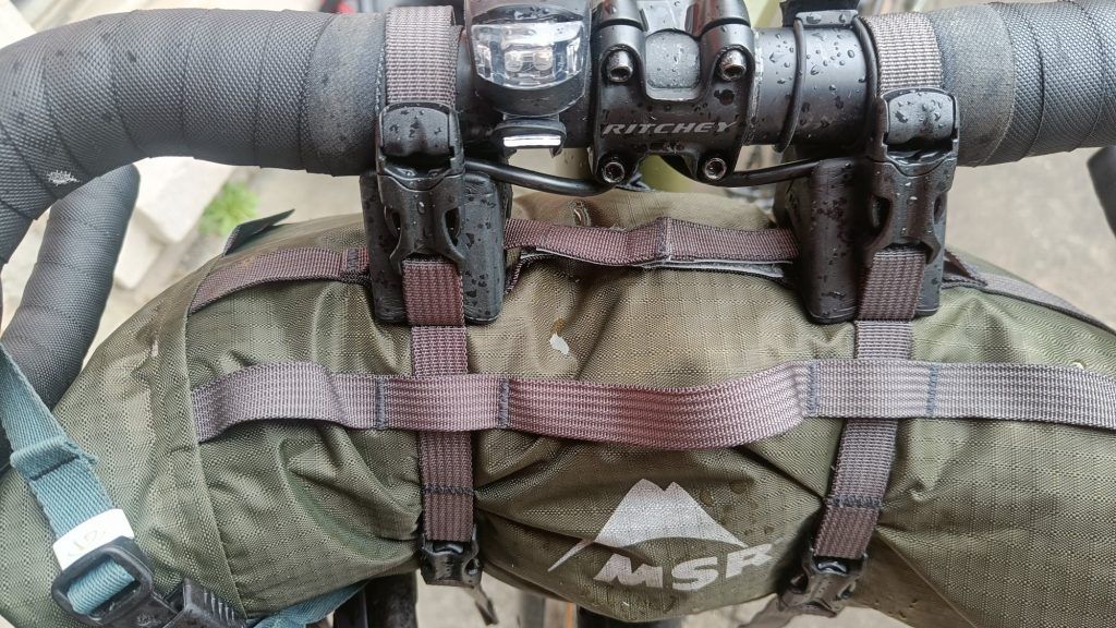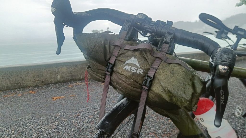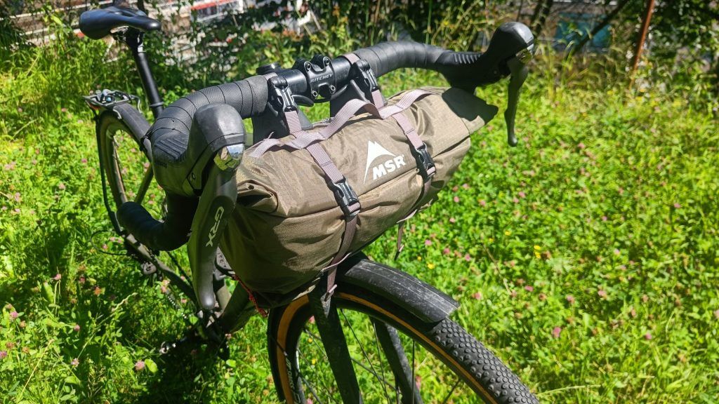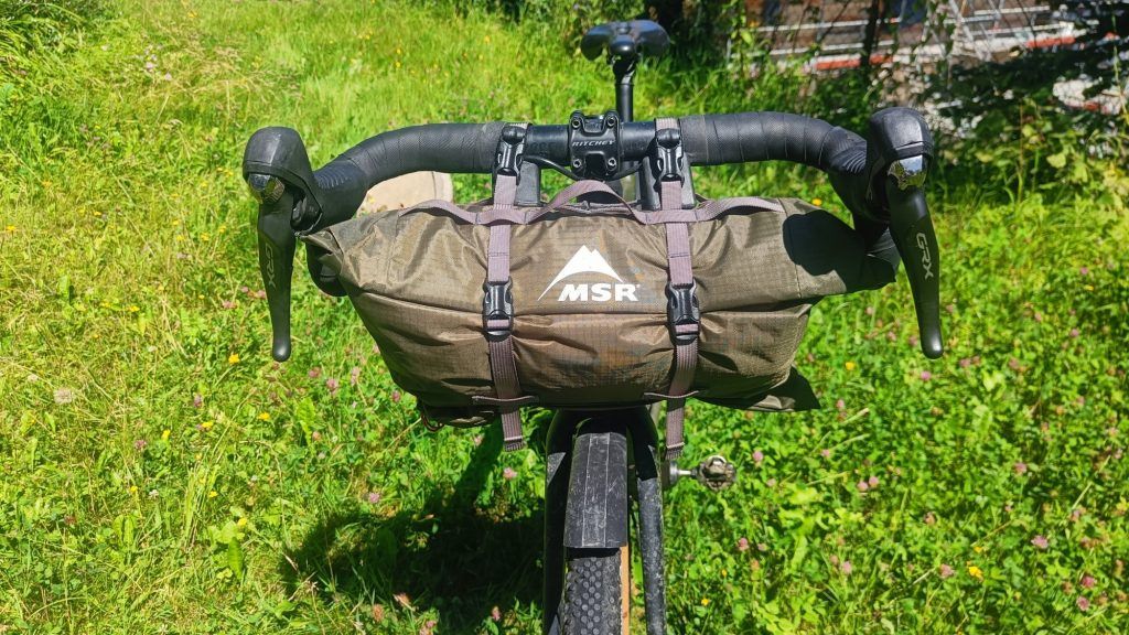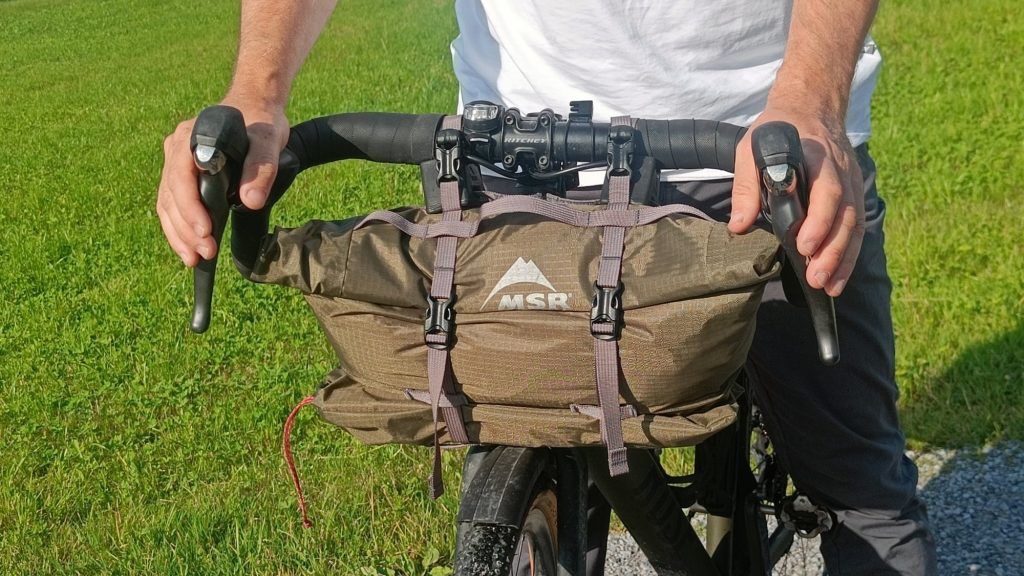 Für das Bikepacking hat MSR zwei Änderungen vorgenommen: Die Gestängelänge wurde auf 31 cm gekürzt (beim Hubba Hubba NX sind es 45,5 cm), sodass das MSR Hubba Hubba Bikepack 2 kompakter gepackt werden kann und auch an einen engen Rennradlenker passt. Zudem wird ein hochwertiger Packsack mit Rollverschluss geliefert, der als Lenkertasche dient. Der wasserdichte Packsack bietet genügend Platz für zusätzliches Material und hat aussen Kompressionsriemen. Für die Fixierung am Lenker gibt es oben gute Schnallen und Abstandhalter, sodass eine einfache Montage möglich ist. Ein elastischer Bändel im unteren Bereich fixiert die Tasche bei holprigen Fahrten, könnte aber für anspruchsvolle Rides besser sein.