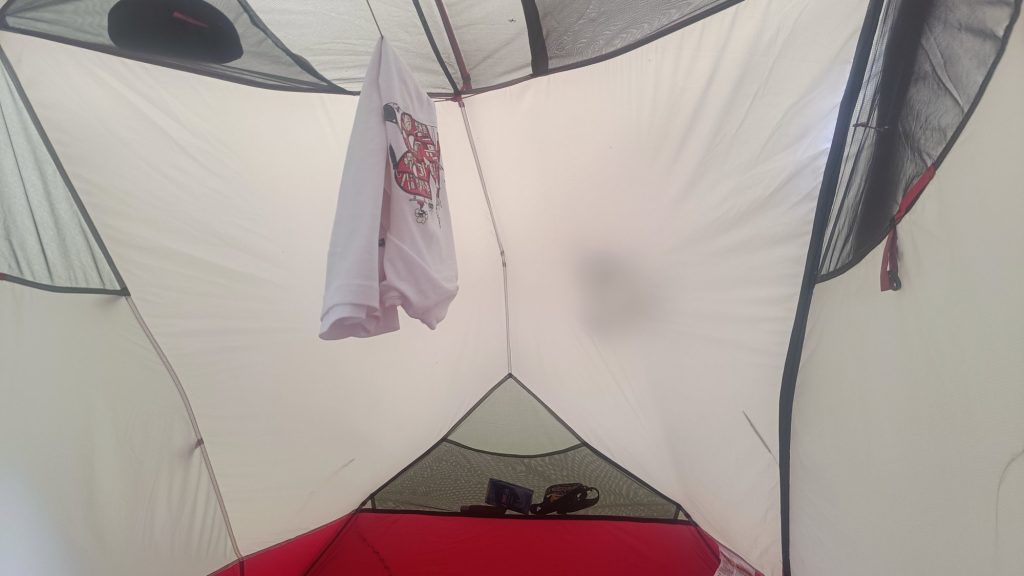 Das Hubba Hubba von MSR ist seit rund zehn Jahren ein Klassiker und eines der meistverkauften Wander- und Tourenzelte. Seine ausgeklügelte Stangenkonstruktion, hochwertige Verarbeitung und gute Grösse haben sich bewährt. Zwei Personen finden darin ausreichend Platz. Dank der rechteckigen Form des Innenzelts und der steilen Seitenwände ist der Aufenthalt angenehm. Mit einer Innenhöhe von gut einem Meter sitzt man bequem und kann sich bei Regen problemlos umziehen. Die beiden Absiden bieten genügend Stauraum für Gepäck, auch bei schlechtem Wetter. Für grosse Personen (ab etwa 190 cm) könnte das Zelt jedoch zu kurz sein. Mit meinen 175 cm habe ich keine Probleme und kann sogar noch Material oben oder unten lagern.