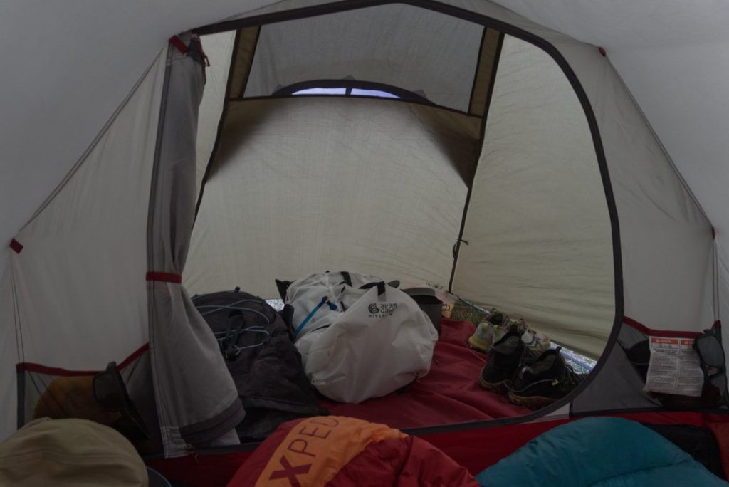 Das Zelt Tindheim 2 von MSR bietet einen seitlichen Zugang, der gross genug ist, um bequem reinzukommen. Der Eingang kann aufgerollt und seitlich fixiert werden. Wenn der Eingang geschlossen ist, kann er mit einer Lasche unten gesichert werden. Der Reissverschluss des Eingangs ist mit einer Regenabdeckung geschützt, lässt sich jedoch nur von unten nach oben öffnen. Manchmal kann sich der Zeltstoff beim Öffnen des Reissverschlusses verhaken.