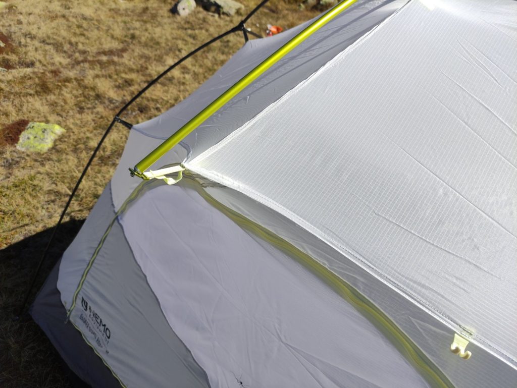Der Aufbau des Nemo Dagger OSMO Ridge ist wirklich einfach. Die Aluminiumstangen sind als ein Stück verbunden und logisch aufgebaut. Dadurch ergibt sich fast automatisch die richtige Struktur. Besonders praktisch ist der Axial Corner Anchor. Damit lässt sich das Zelt auch mit einer Hand abspannen und nachjustieren. Die Bodenplane passt perfekt dazu und kann einfach eingehängt werden.