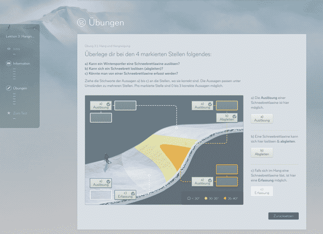 Anhand von aufeinander aufbauenden Lektionen lernt der User schrittweise mehr über Lawinenkunde. Jede Lektion hat ein Lernziel. Spielerische Übungen laden ein, den Lerninhalt zu üben und zu festigen. Am Schluss einer Lektion kann das gelernte Wissen mit einem Test überprüft werden. In jeder Lektion gibt es zudem viele Links zu den verwandten Themen im Modul „EXPLORE“.