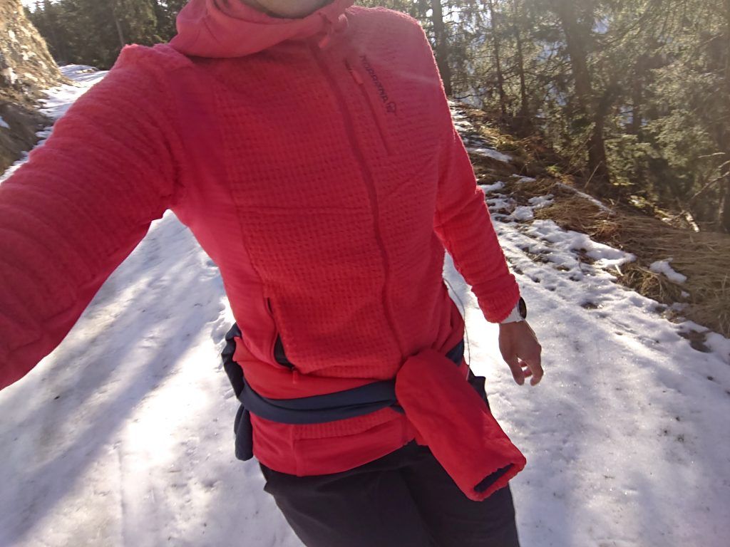 Ich habe mich dann schnellstens an den Test gewagt. Der Norrøna lofoten Alpha120 Zip Hoodie ist in der Passform perfekt für Sport. Genügend lang, sehr elastisch, lange Ärmel mit einem Bund mit Daumenschlaufe, eine hoher Kragen und eine gut anliegende Kapuze. Zudem hat er zwei grosse Reissverschluss-Seitentaschen und noch eine kleinere Brusttasche. Also alles was man von so einem Jäckchen zum Sport treiben wünscht. Die ganze Verarbeitung ist – wie man es sich von Norrona gewöhnt ist – sehr gut.