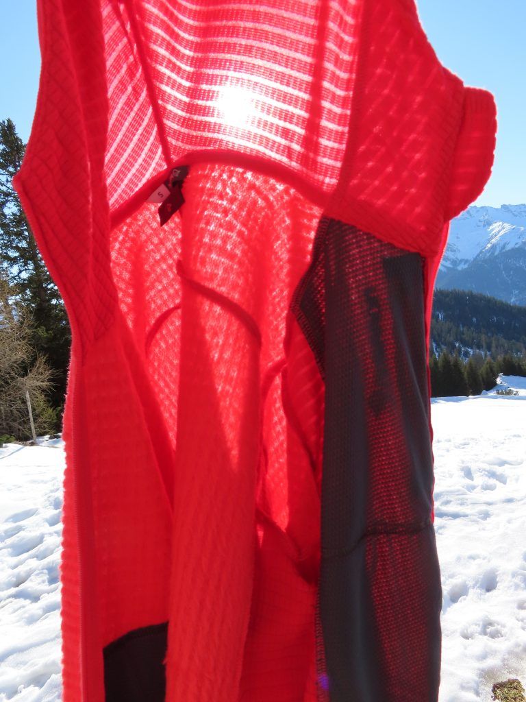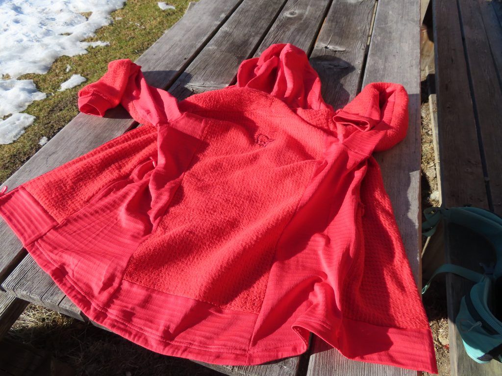 Das bedeutet, dass der Hoodie extrem weich, flauschig und ein tolles Trageerlebnis bietet. Aber es bringt auch eine extrem hohe Atmungsaktivität. Dadurch, dass kein anderes Material diese Isolationsschicht einhüllt, kann der Schweiss problemlos nach aussen geleitet werden. Wenns mal richtig kalt ist, sieht man die Feuchtigkeit an der Aussenseite des Hoodies. Somit ist aber auch gegeben, dass der Hoodie jeweils nur in Einsatz kommt wenn wirklich kein Wind geht, ansonsten nützt die Isolation nichts.