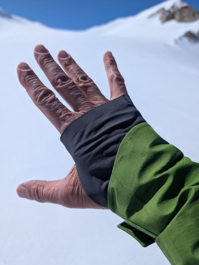 Die integrierten Stretch-Handgamaschen verhindern zuverlässig, dass Kälte oder Schnee in die Ärmel eindringen. Besonders bei windigen Bedingungen funktioniert das sehr gut.