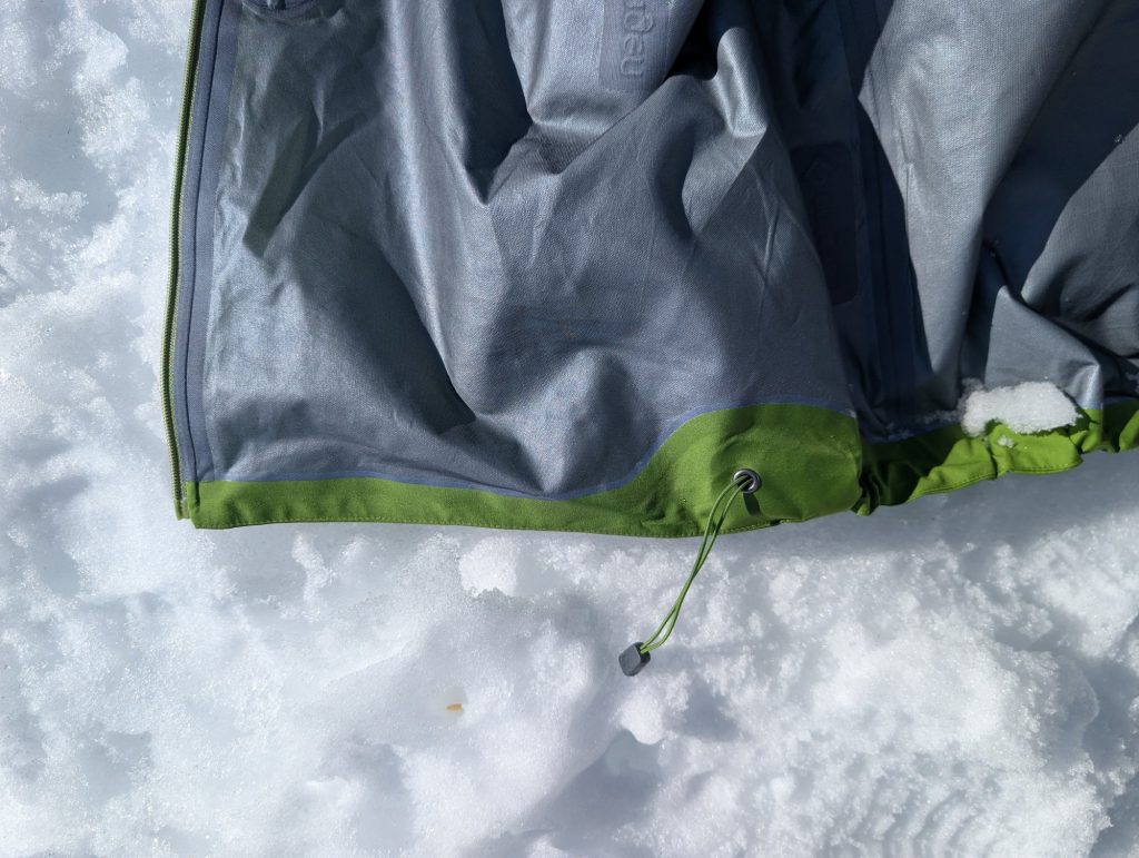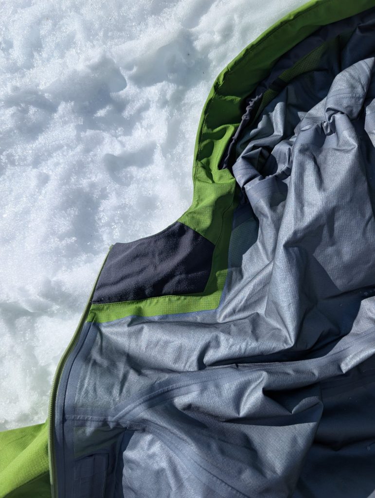 Das Material ist bewusst leichter und etwas dünner als bei klassischen Freeride-Jacken, wirkt aber dennoch langlebig und gut verarbeitet.