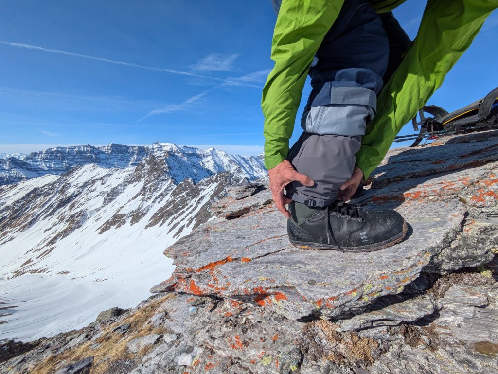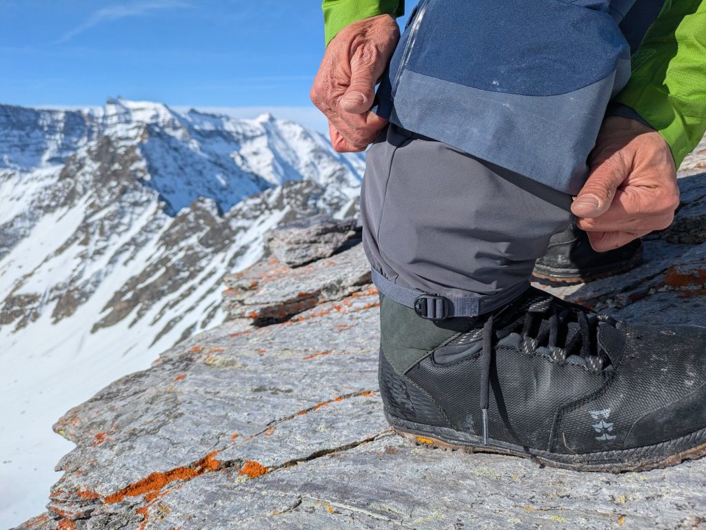 Die verstellbare Schneegamasche der Norrøna Lyngen Gore-Tex Pants dürfte für breitere Snowboard-Boots etwas weiter geschnitten sein – sie funktioniert, sitzt jedoch eher knapp. Positiv ist der robuste untere Beinbereich, der bei der Verwendung von Steigeisen guten Schutz bietet.