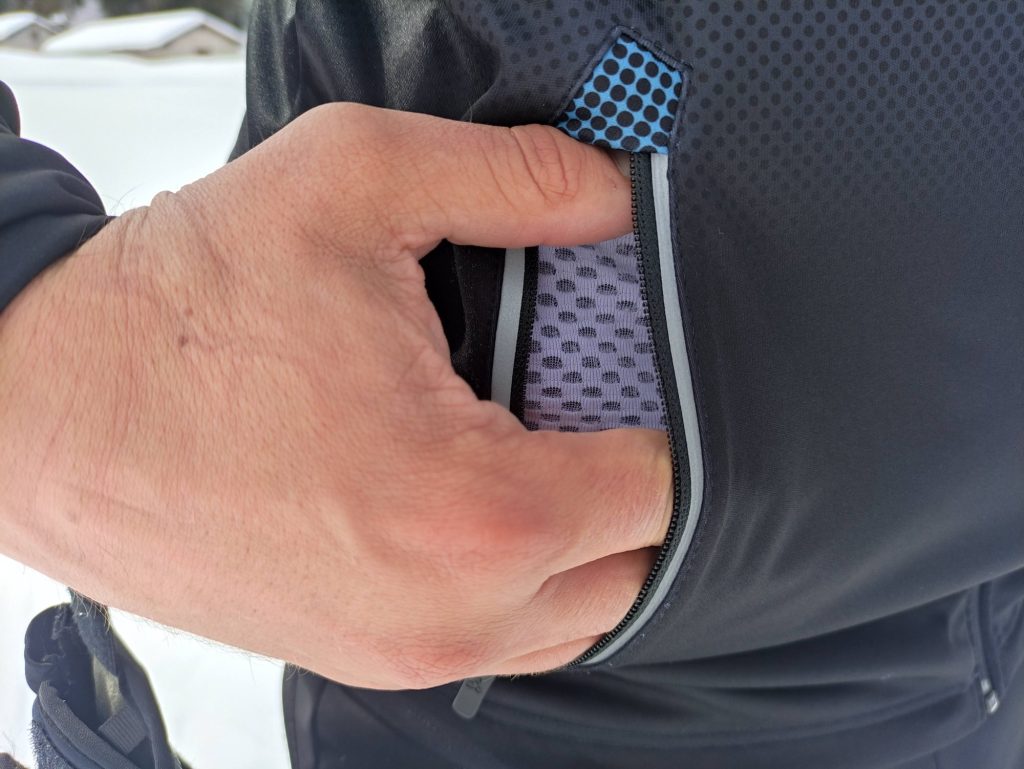 Vorne schützt ein warmes Softshell-Material, hinten sorgt dehnbarer Jersey für Belüftung. Diese Kombination macht Sinn: Windschutz vorn, Atmungsaktivität hinten. Der Feuchtigkeitstransport funktioniert gut – Schweiss wird zügig abgeleitet, ohne dass es klamm wird. Bei intensiven Einheiten fühlt sich die Jacke trotzdem trocken an. Zwei Vordertaschen bieten Platz für Kleinigkeiten. Der Kordelzug am Saum ist mit einer Hand einfach bedienbar.