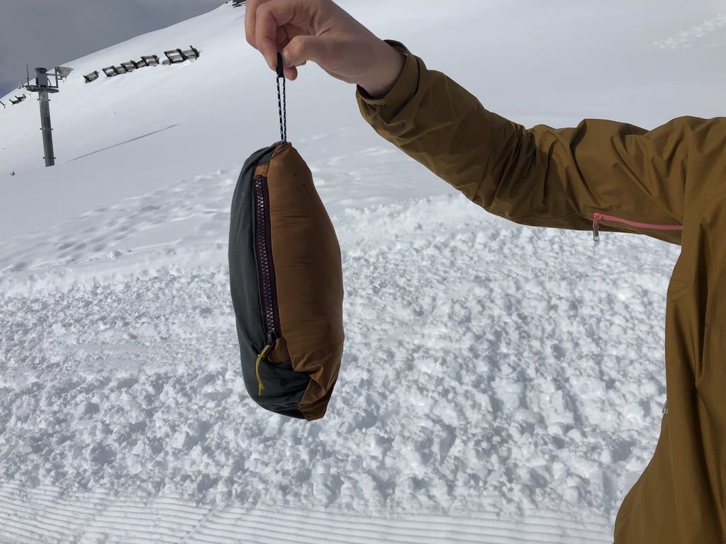 Wenn man wieder im Tal unten ist und es fast schon frühlingshaft warm ist, kann man den Outdoor Research Women’s Transcendent Down Hoody auch gut verstauen. Die Daunenjacke lässt sich komplett in die eigene Tasche einpacken und so ist sie zum einen geschützt (vor Pickel und anderen scharfen Dingen, die man manchmal im Rucksack halt so dabei hat), zum anderen kann man sie mit dem eingebauten Karabinerhacken auch einfach befestigen (was gerade bei Wind von Vorteil sein kann).
