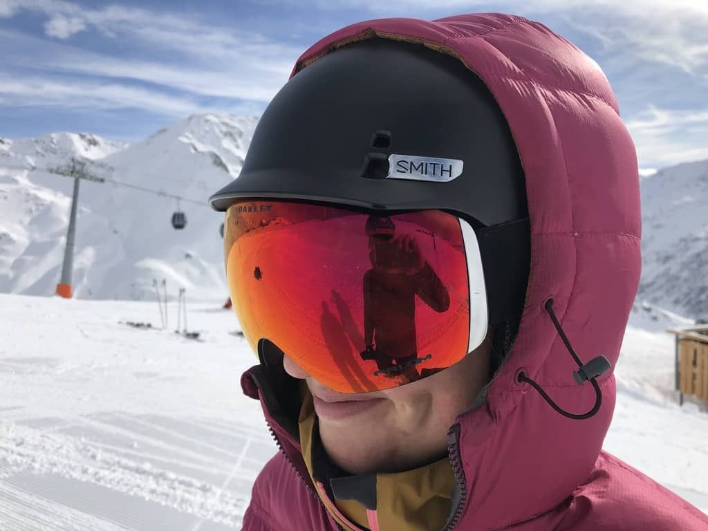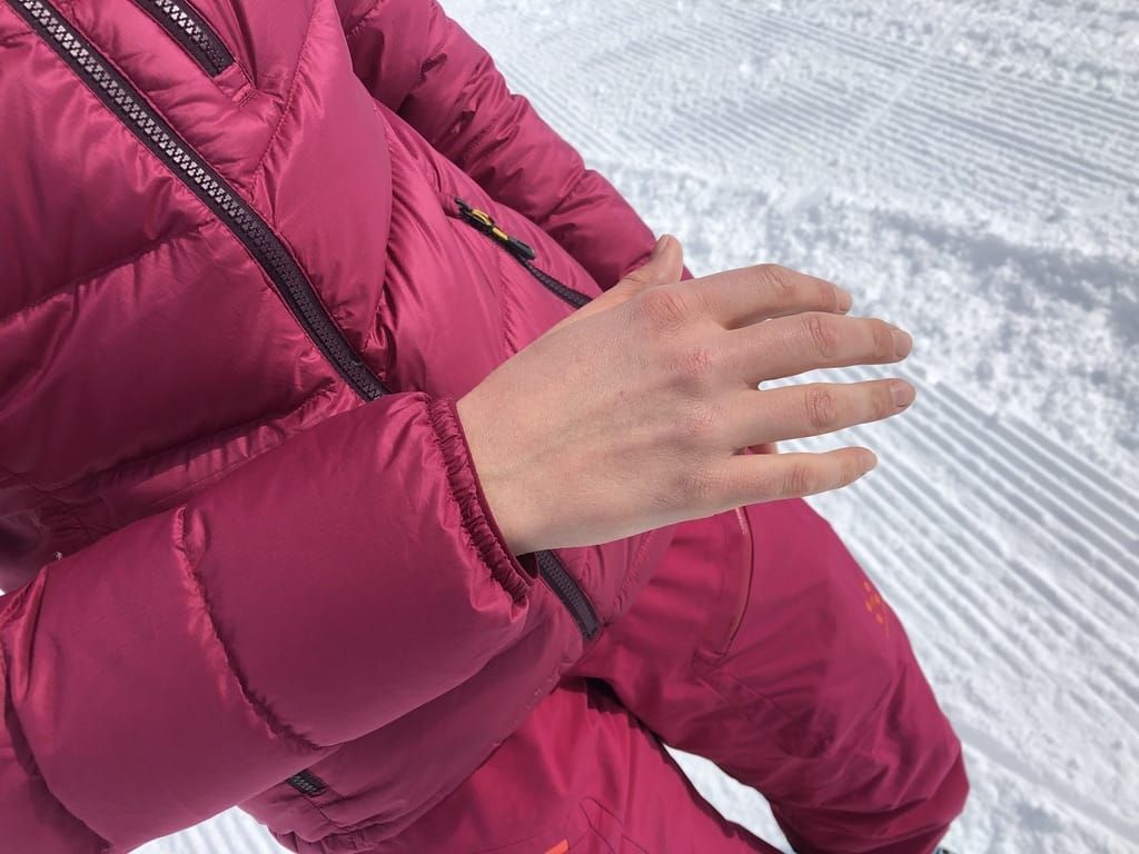 Natürlich hat die Jacke ein paar coole Features: Das Aussenmaterial der Jacke (20-Denier Ripstop-Polyester aus Recycling) ist ziemlich robust und geht nicht gleich kaputt, z. B. wenn man mal mit der Aussenkante der Ski an die Jacke kommt. Das habe ich bei anderen Daunenjacken auch schon anders erlebt.