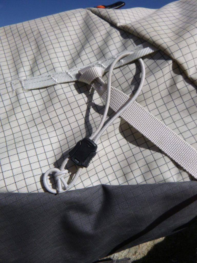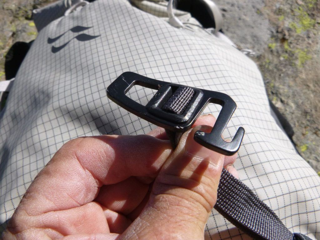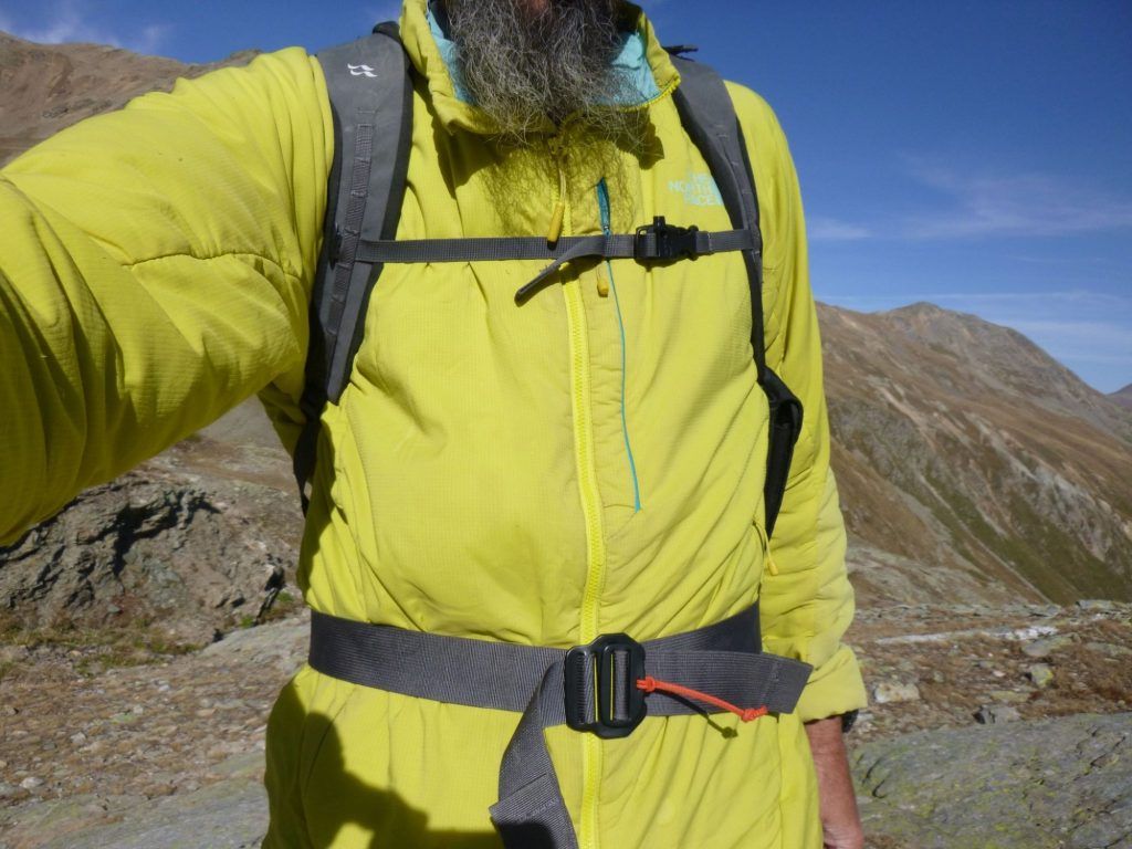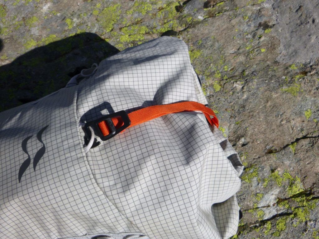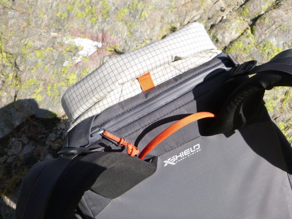 Zudem gibt es ein von aussen zugängliches Extrafach im oberen Teil, mit wasserdichtem Reissverschluss ausgeführt. Der demontierbare Bauchgurt mit der Schnellverschluss-Schnalle ist spartanisch gehalten, ohne Polsterung oder Effektentasche. Die Träger sind anatomisch geformt und eher hart ausgeführt, ein kleiner, verstellbarere Brustgurt mit integrierter Notfallpfeife vervollständigt das erstaunlich bequeme Tragsystem.