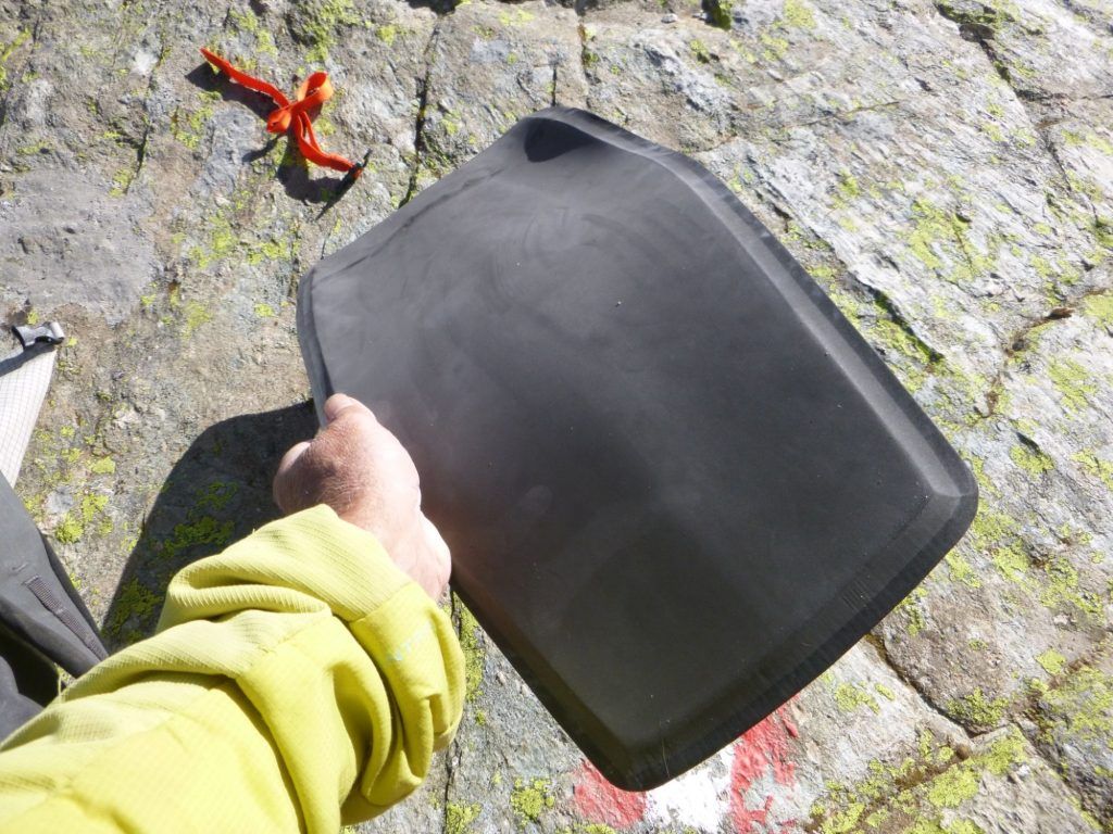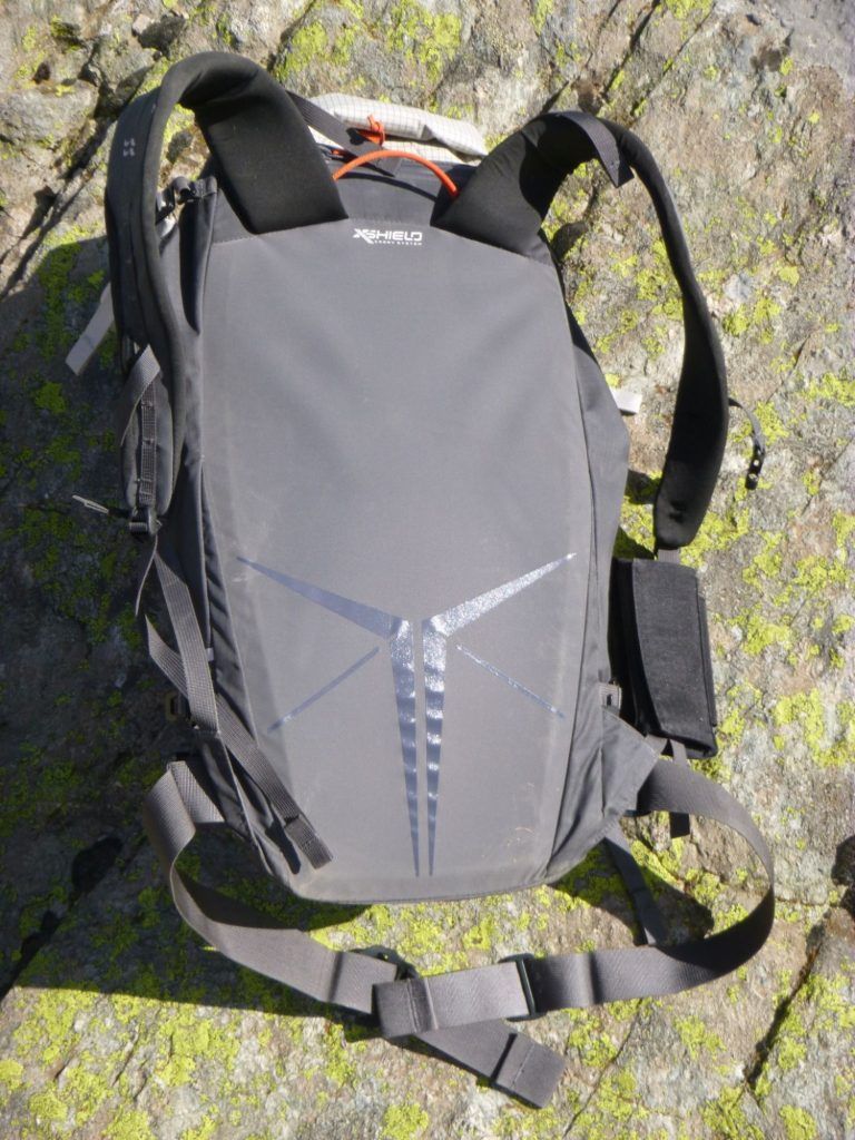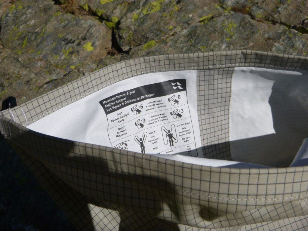 Die Rückenkonstruktion X-Shield liegt flächig auf, damit ist die Lüftung stark eingeschränkt und das T-Shirt sehr schnell durchnässt, insbesondere durch die wasserabweisende Beschichtung, weshalb ich dem Rab Latok 28 hier einen Minuspunkt geben muss. Innwendig findet man noch ein aufgedrucktes Notfall-Schema. Aussen die üblichen, hier sogar demontierbaren Pins für Eisgeräte und Befestigungsmöglichkeiten, demontierbare Komressionsriemen / Ski- / Stockhalterungen, sowie der ebenfalls demontierbare Gurt für die Seilbefestigung. Einen Durchlass für Trinkblasenschlauch sucht man indes vergeblich.