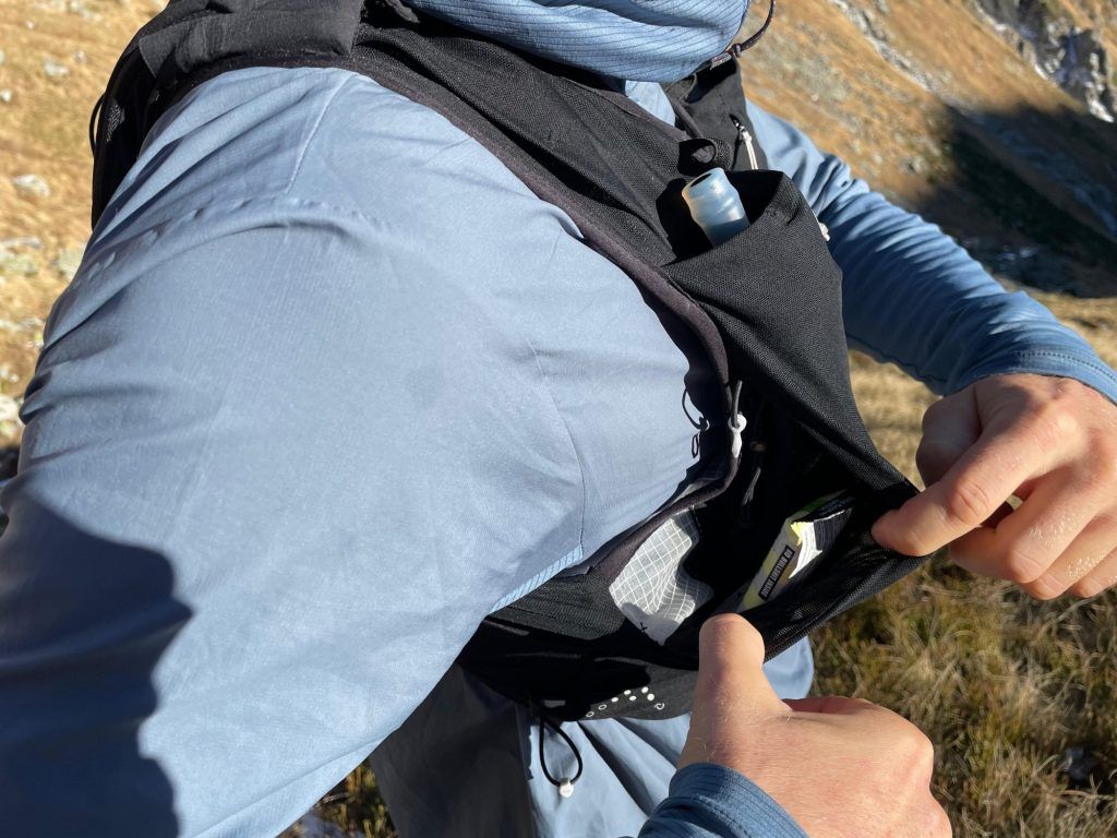 Wie bereits erwähnt bietet die Rab Veil 12L sehr viel Stauraum und Taschen. Gefühlt wurde jede Möglichkeit für eine Verstaumöglichkeit grosszügig genutzt. Ich bin mir nicht sicher ob ich bis jetzt schon wirklich alle Taschen gefunden habe… Alle Taschen sind grosszügig dimensioniert, was mir persönlich gut gefällt. Handy, Windjacke, 0.5L Flasks, Riegel, all das findet problemlos in den Brusttaschen Platz. Separate Taschen für Schlüssel und Notfallpfeife sind ebenfalls vorhanden.