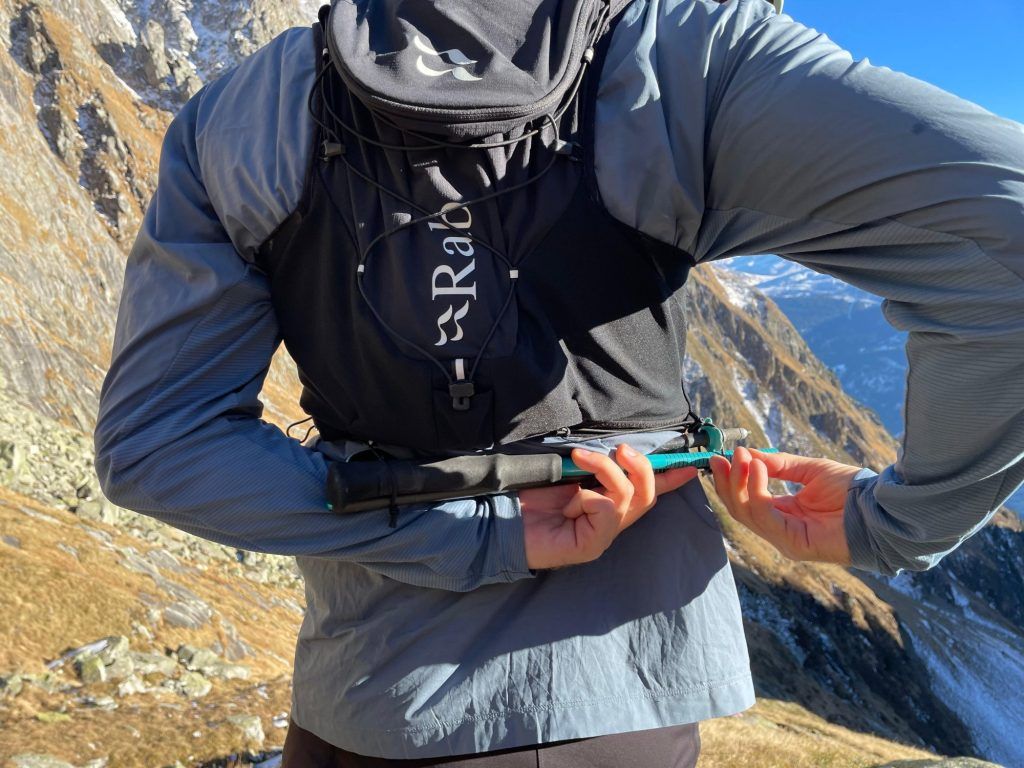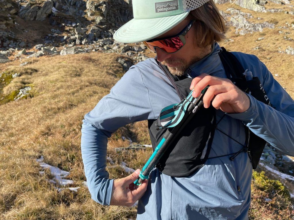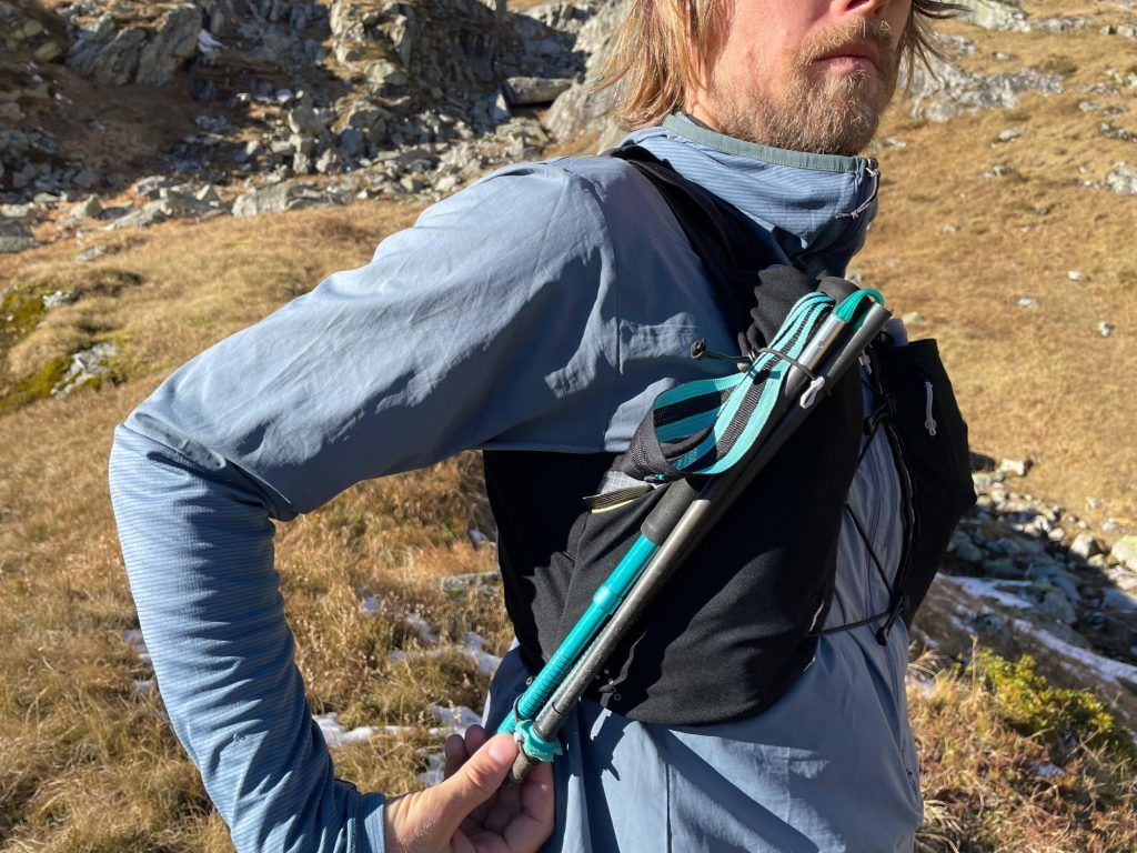 Der Verschluss an der Brust ist etwas hackelig und Aufwändiger gestaltet als bei anderen Laufwesten. Stöcke lassen sich hinten am Rücken, seitlich unter den Armen oder allenfalls auch vorne über die Brust befestigen. Versorgen und hervor nehmen der Stöcke während dem Laufen, funktioniert meiner Meinung nach gut.