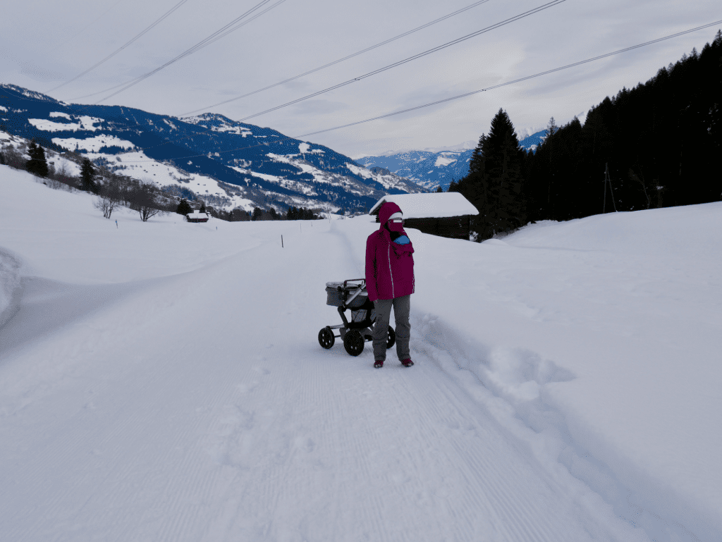 Wenn du dich für den Kinderwagen entscheidest, ist ein guter Fusssack Pflicht, am besten einer mit Isolation (hier ist pflegeleichte Kunstfaser wie z.B. PrimaLoft® mein Favorit) für extra Wärme. Auch ein Regenschutz ist Gold wert, denn selbst bei Schnee kann es mal nieseln. Und vergiss die Wickeltasche nicht! Neben den üblichen Utensilien pack unbedingt Ersatzkleidung, eine warme Decke und Handwärmer ein. Ich persönlich nehme immer auch ein Thermosfläschchen mit heissem Wasser mit, falls das Fläschchen unterwegs auskühlt.