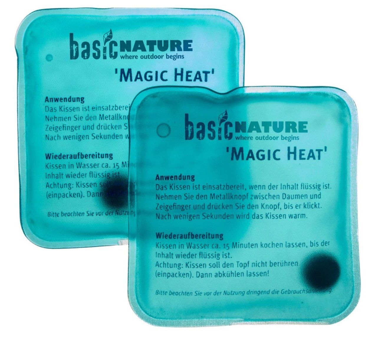 Diese Handwärmer enthalten eine Flüssigkeit, die bei Aktivierung durch Knicken einer Metallplatte kristallisiert und dabei Wärme abgibt. Sie bieten allerdings nur etwa 1 bis 2 Stunden Wärme und müssen danach in heissem Wasser reaktiviert werden. Sie eignen sich gut für kürzere Anwendungen oder Pausen z.B. in der Gondel oder auf dem Gipfel und haben den Vorteil, dass Sie mehrfach verwendbar sind.