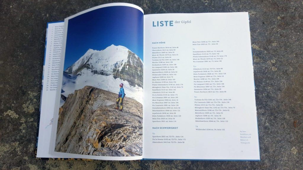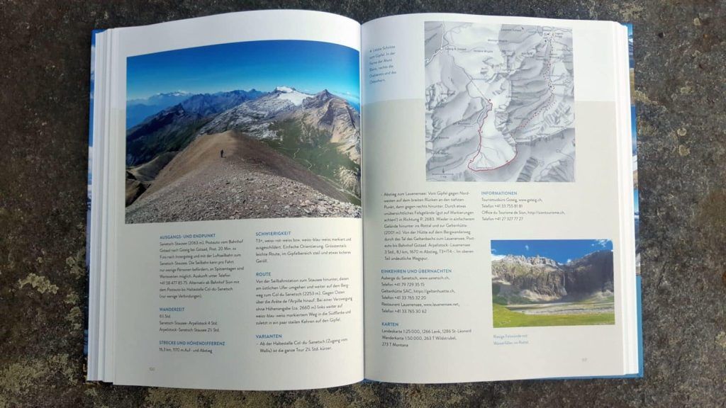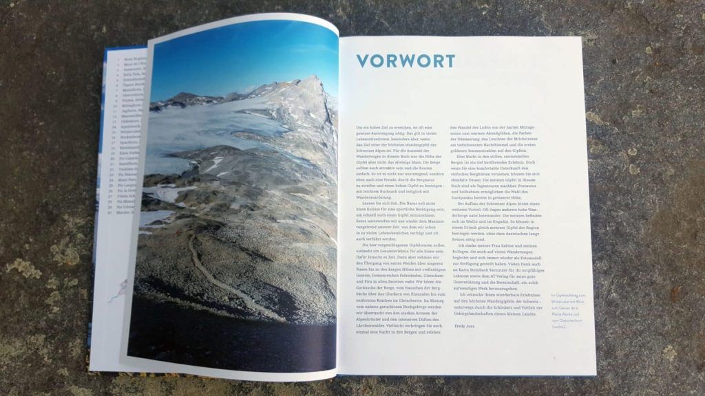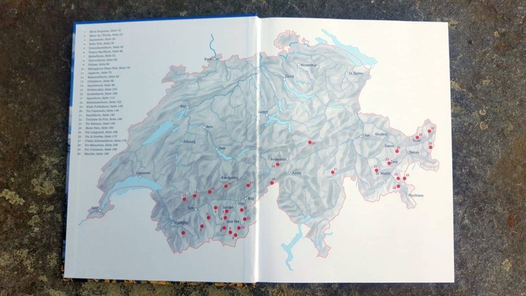 Im Buchdeckel sind alle Touren auf einer Landkarte verzeichnet, was bei der Vorauswahl einer Tour sehr hilft. Was mir persönlich sehr gefällt, ist, dass bei den Touren im Buch «Zu den höchsten Wandergipfeln der Schweiz» noch weitere Varianten genannt werden, um etwas Abwechslung hineinzubringen.