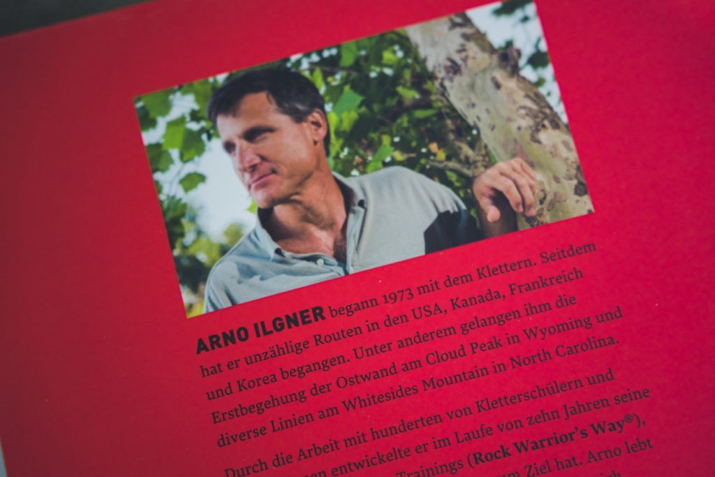 Bei so einem Buch, das einem ja gerne verspricht, dass man dadurch um einiges besser Klettern kann, ist natürlich ziemlich entscheidend, wer das Buch geschrieben hat. Denn immerhin rühmt es sich mit einer ®-Registrierung der „Rock Warrior’s Way Methode“. Nun denn, der Autor ist Arno Ilgner. Der Name sagt mir auf die schnelle nichts, zum Glück hat es im Klappenumschlag ein nettes Bild und einen kleinen Text. Dort heisst es, dass er seit 1973 intensiv am Klettern ist, und im Umgang mit hunderten Kletterschülen die Rock Warrior’s Way Methode entwickelt hat.