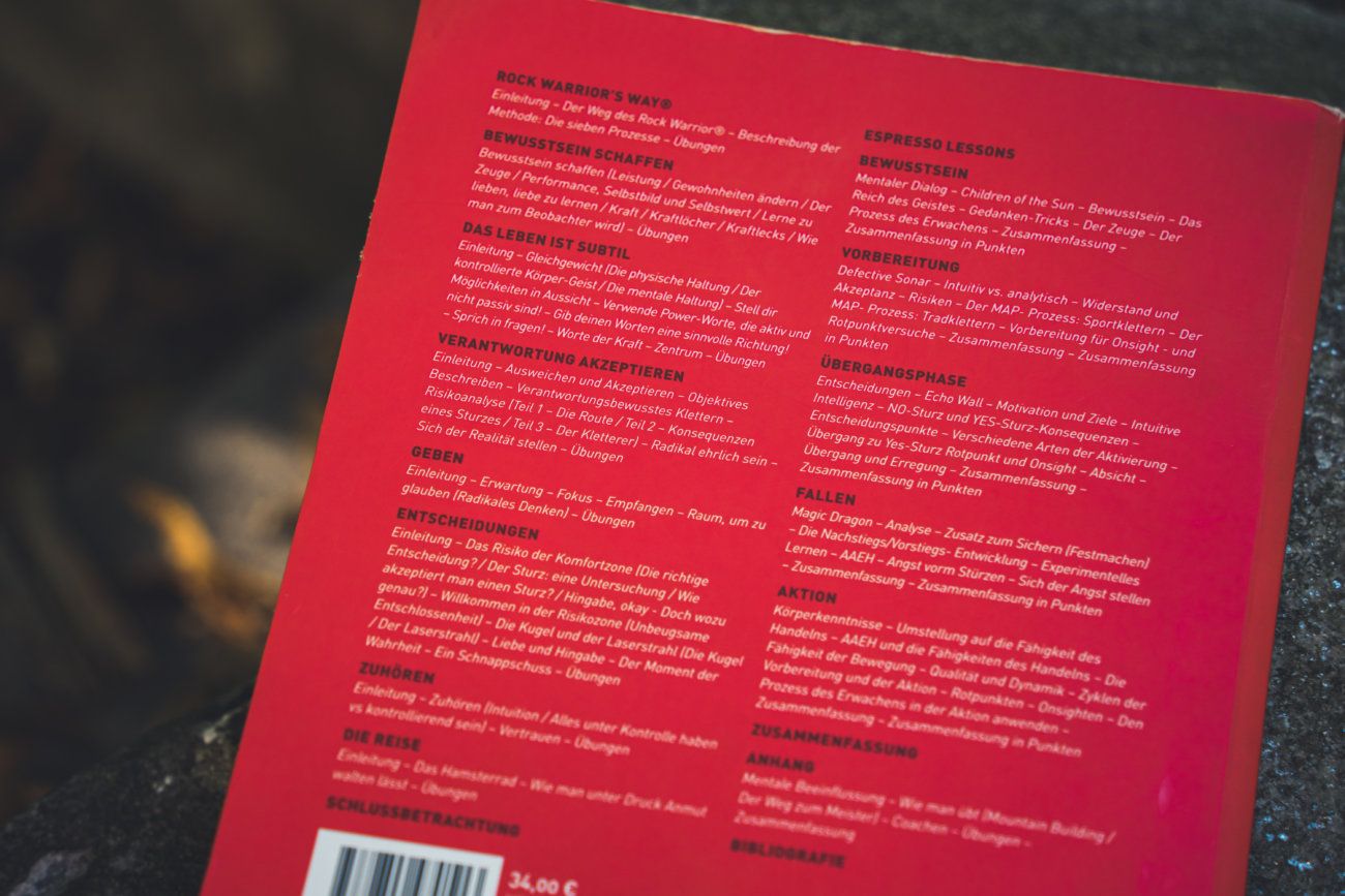Das Buch Rock Warrior’s Way ist aufgeteilt in eine Einleitung von John Long. Der war in den 70er- und 80er-Jahren einer der bedeutendsten amerikanischen Kletterer. Danach kommt das Vorwort von Arno Ilgner persönlich – nochmals eine Einleitung. Dann werden sieben Prozesse kurz beschrieben. Danach werden die sieben Prozesse ausführlich beschrieben, darauf folgen ein paar Übungen und Zusammenfassungen.