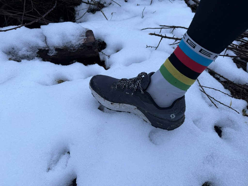 Natürlich wäre der Test nicht komplett, wenn ich den Scott SCOTT Kinabalu 3 GORE-TEX nicht auf unterschiedlichen Untergründen ausprobiert hätte. Im Wald und auf Schotter funktioniert er ganz gut und macht Spass zu tragen. Sobald es jedoch schlammig wird, hat der Schuh mehr Probleme mit dem Grip. Am meisten enttäuscht hat mich, dass er auf grösseren (flachen) Steinen – ausserhalb der Berge – Mühe hat, Halt zu finden. Ich bin dort fast ausgerutscht.