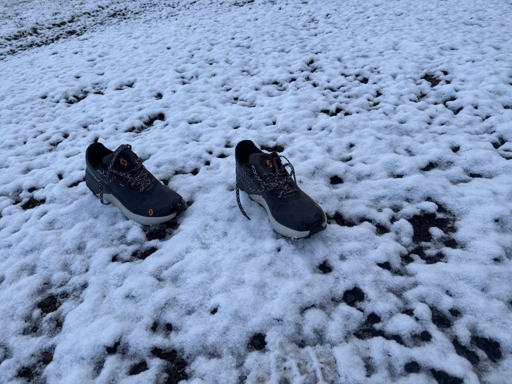 Wenn es zu warm ist, beginnen meine Füsse wegen der Isolierung zu schwitzen, und das Obermaterial ist meist nicht vollständig dicht. Deshalb macht es wenig Sinn, sie bei Regen oder wärmeren Temperaturen zu tragen. Ich trage Gore-Tex-Schuhe eher selten, meistens wenn der Untergrund noch nass ist und die Temperaturen noch nicht sehr hoch sind. So bleibt mein Fuss von unten trocken, und von oben kommt in der Regel keine Nässe hinein – ausser ich trete in eine Pfütze. Als ich die Scott SCOTT Kinabalu 3 GORE-TEX erhalten habe, musste ich warten, bis die richtigen Bedingungen zum Testen gegeben waren.