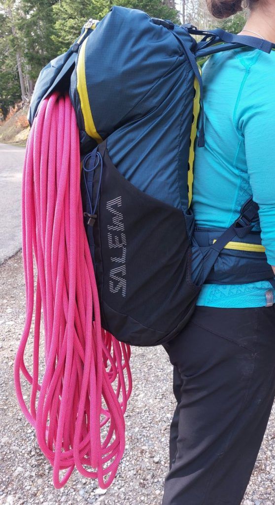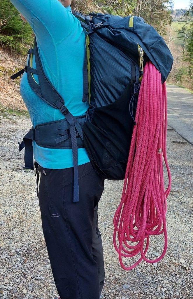 Der Rucksack bietet zahlreiche Befestigungsmöglichkeiten für Ausrüstung, darunter Gummischlaufen für Wanderstöcke und eine Daisy Chain für zusätzliche Ausrüstung. Trotz dieser Vielseitigkeit fand ich den Reissverschluss, der sich bis zum Boden öffnen lässt, aufgrund seiner unpraktischen Form schwer zu handhaben, besonders wenn der Rucksack voll ist.