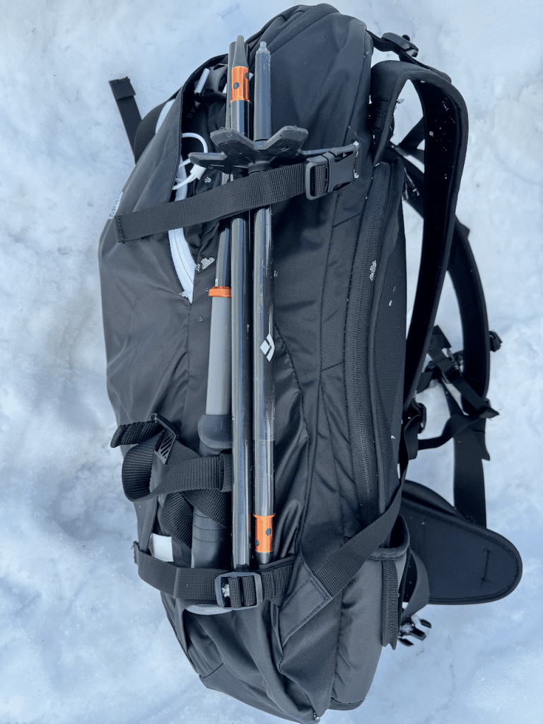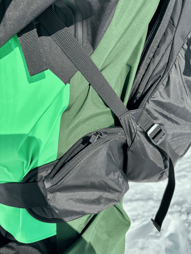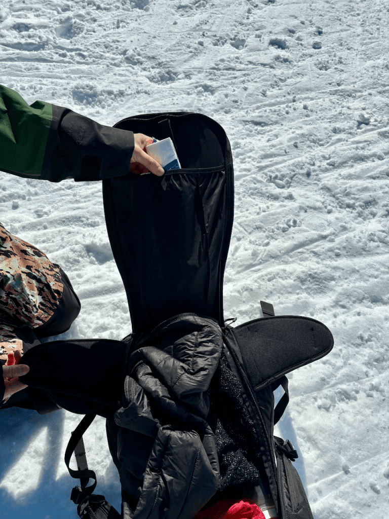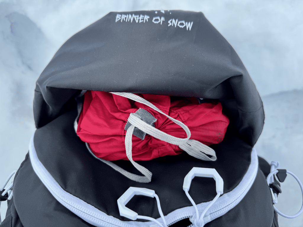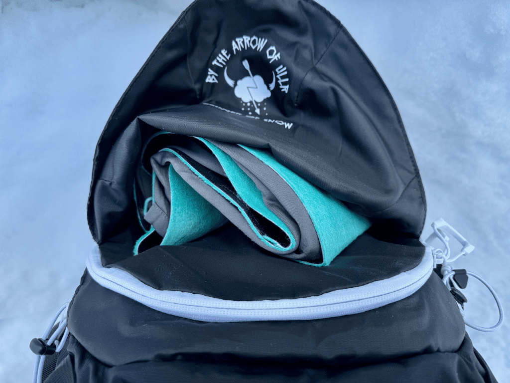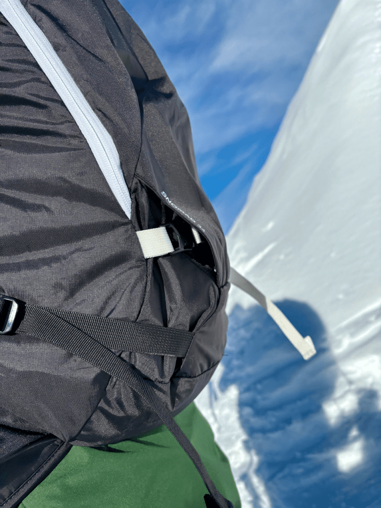 Der wahre Clou ist allerdings der Zugang zum Hauptfach über die Rückenplatte. Diese Lösung erlaubt es, an das Hauptfach zu gelangen, selbst wenn der Winterrucksack im Schnee liegt oder wenn Ski oder anderes Wintersportgerät aussen befestigt sind. So bleibt der Inhalt trocken und zugänglich, ohne dass man alles abnehmen muss.