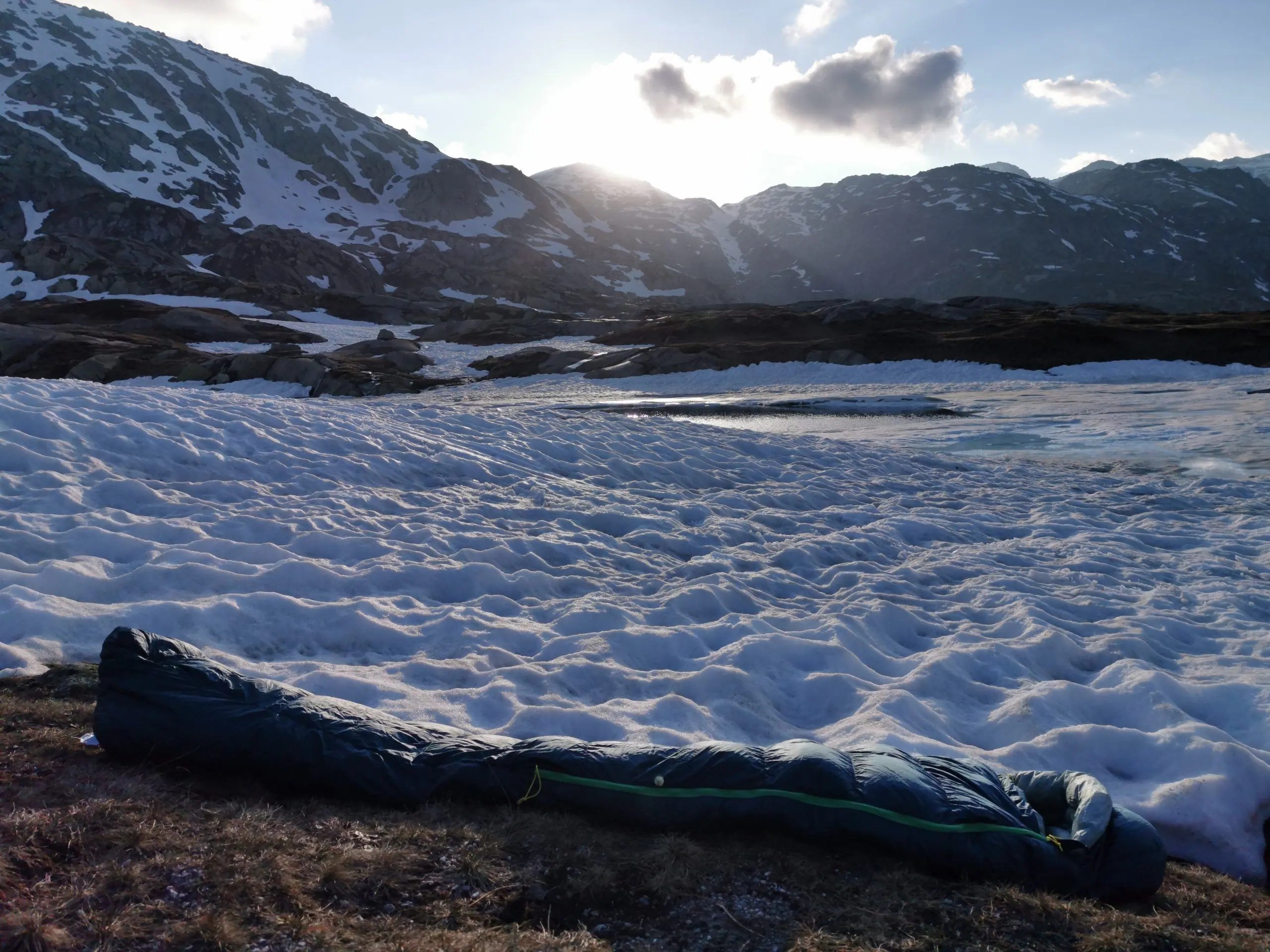 Auf dem Gotthardpass auf 2100 m Höhe, Ende Mai bei ca. 0 °C Tiefsttemperatur in der Nacht, ist der Therm-a-Rest Hyperion 20 F/-6 °C Schlafsack in seinem Element. Besser konnte ich die Idealtemperatur für diesen Daunenschlafsackwohl nicht treffen. Die Nacht war fantastisch. Aber fangen wir von vorne an …