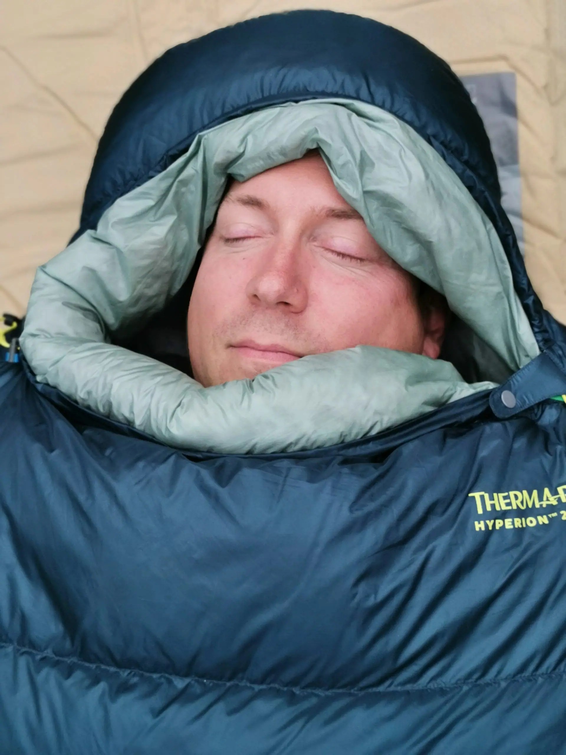 Ich hatte die gesamte Nacht über eine angenehme Temperatur im Therm-a-Rest Hyperion 20 Daunenschlafsack, nicht zu kalt und nicht zu warm. Und ein äusserst angenehmes Klima, was die Feuchtigkeit angeht. Da wir zu dritt im Zelt lagen, lag die Temperatur im Zelt bei ca. 3-4 Grad. Also leicht über der angegeben Komforttemperatur. Mit noch mehr Kleidern und vielleicht einem Seidenschlafsack kann ich mir die -6 Grad Limit-Temperatur gerade noch vorstellen, aber darunter würde ich den Schlafsack auf keinen Fall einsetzen! Und bitte bedenkt, dass viele Frauen eher noch kälteempfindlicher sind.