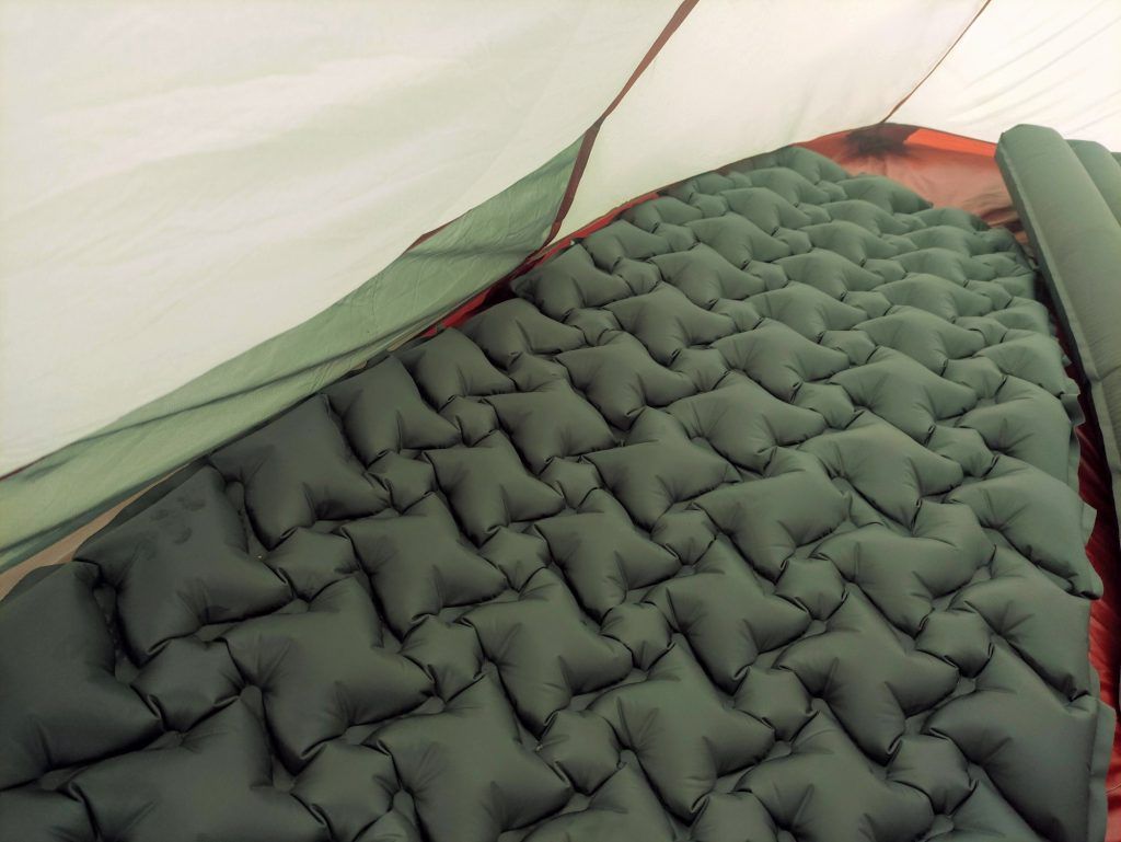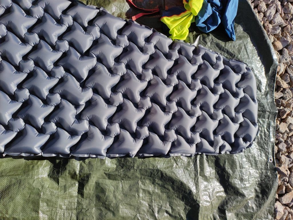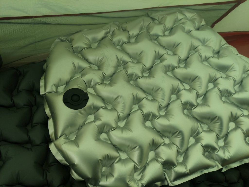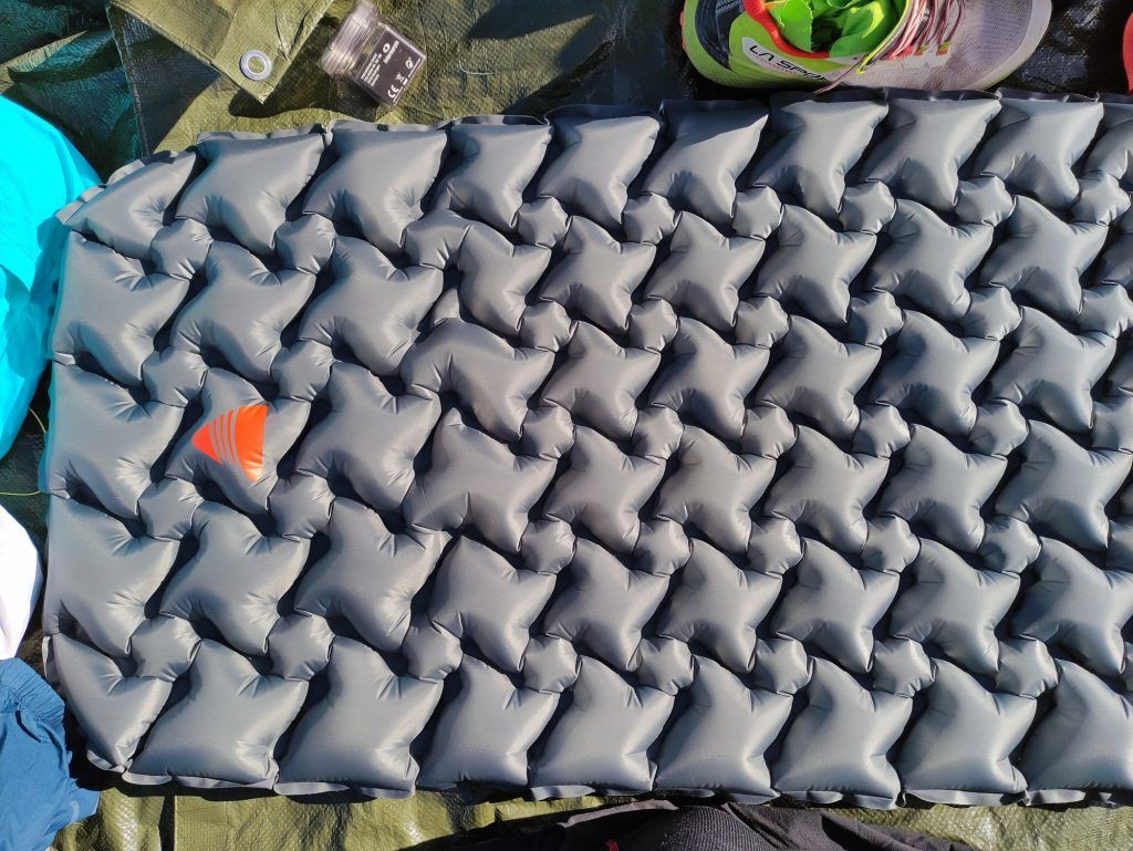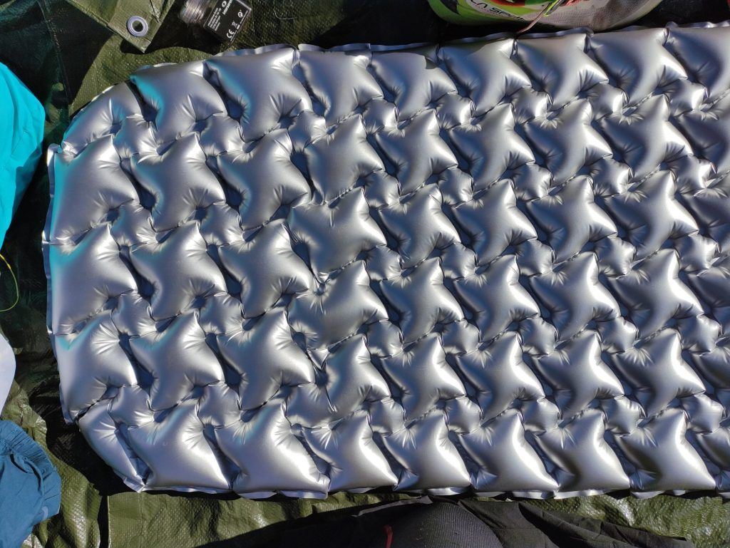 Weiter fällt auf, dass die Matte viel länger ist als 185 cm, wenn sie nicht aufgeblasen ist. Beim Aufblasen wird sie durch die geschweissten Kanäle jedoch kürzer. Die Vango Aotrom Thermo Platinum ist aus einer TPU Gewebelaminierung, welche leichter und umweltfreundlicher als herkömmliche PVC Materialien ist.
