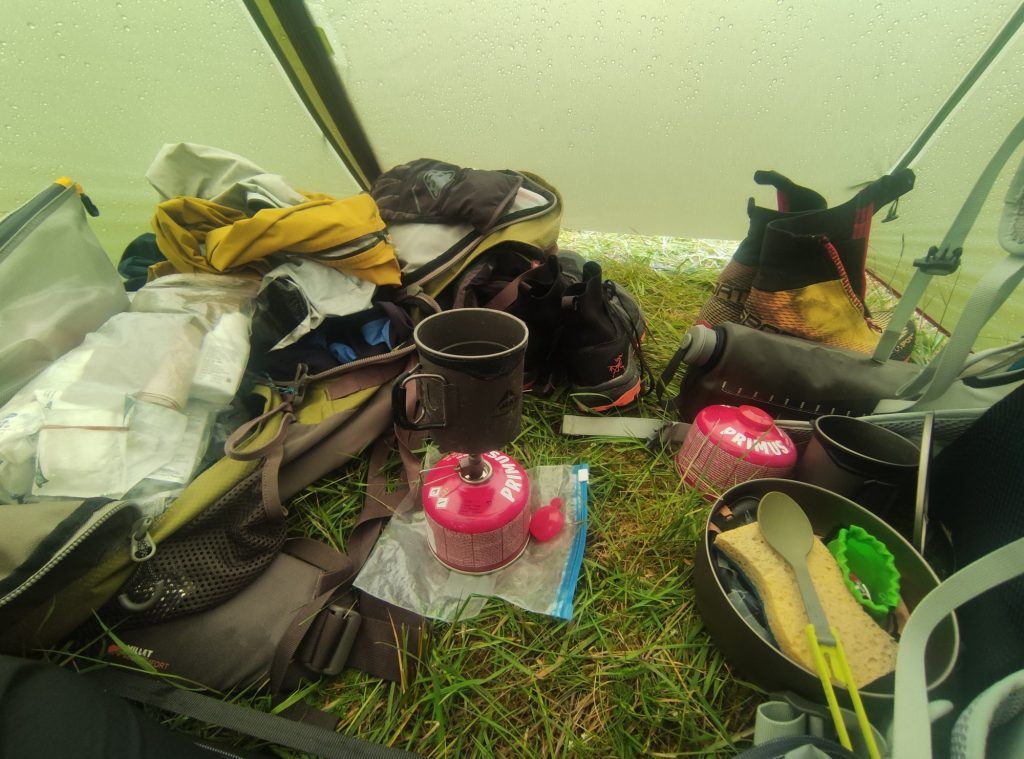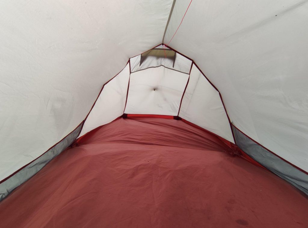Der Innenraum des Vango F10 Xenon UL 2 bietet genügend Platz für zwei Personen, sodass Schlafsäcke und Rucksäcke komfortabel untergebracht werden können. Die Höhe ist ausreichend, um sich gut bewegen zu können, und die durchdachte Belüftung sorgt für ein angenehmes Klima. Zusätzlich gibt es viele Taschen für kleinere Utensilien, was die Organisation im Zelt erleichtert.